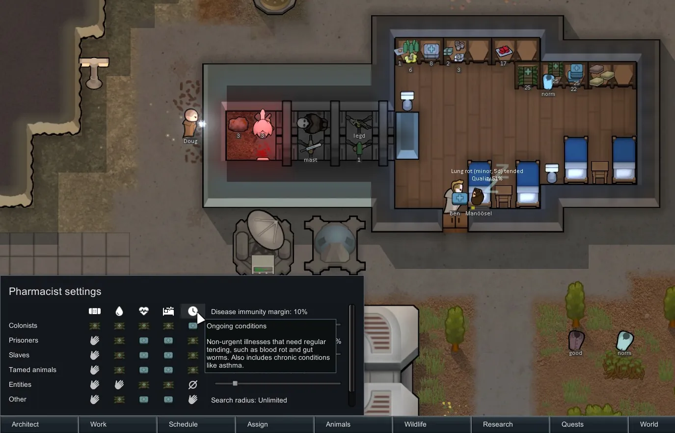 [*] Added an "Ongoing conditions" classification. This includes non-fatal diseases like gut worms and fibrous mechanites, but also includes long-term illnesses like blood rot and asthma. It does [i]not[/i] include immunity-based diseases like plague, flu, and infections; Pharmacist still prescribes for those based on severity and immunity gain progress. Otherwise, anything that must be regularly tended will generally fall into this category.