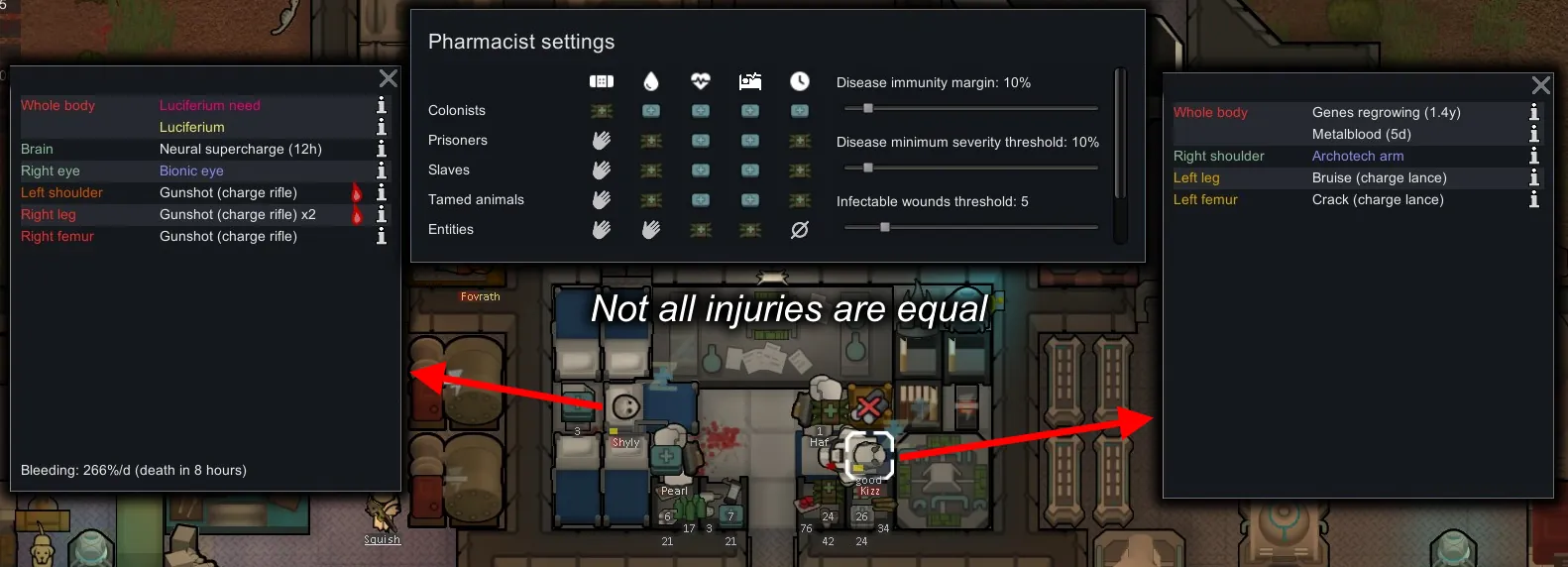 A continuation/fork/successor of the lovely mod Pharmacist, originally created by Fluffy. For a full description of what the mod does, you can consult the [url=https://steamcommunity.com/sharedfiles/filedetails/?id=1365242717]original page[/url], but in short: Pharmacist allows you to set the maximum level of medicine that can be used for different severities of injury. Doctors will determine which medicine to use based on the type of wound, the Pharmacist's configured settings, and the target's individually-configured medical care (as in vanilla.)
