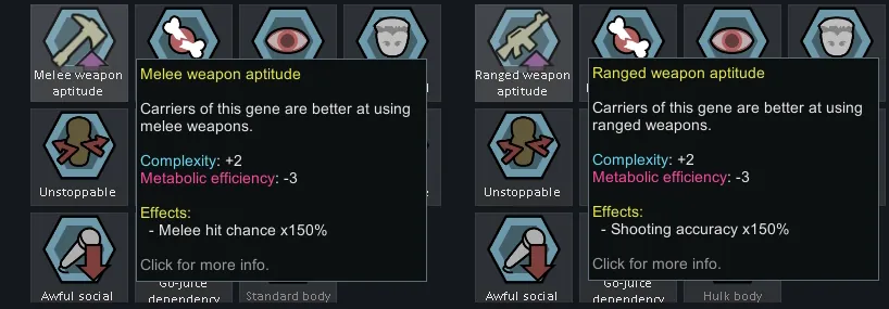 That's it. No weapon-specific aptitudes, no anything. Just two genes that make a pawn better at a style of combat.
