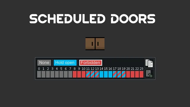 Adds the ability to schedule when doors are held open and forbidden. Github: [url=https://steamcommunity.com/linkfilter/?u=https%3A%2F%2Fgithub.com%2Fkittycat2002%2FScheduledDoors]https://github.com/kittycat2002/ScheduledDoors[/url]