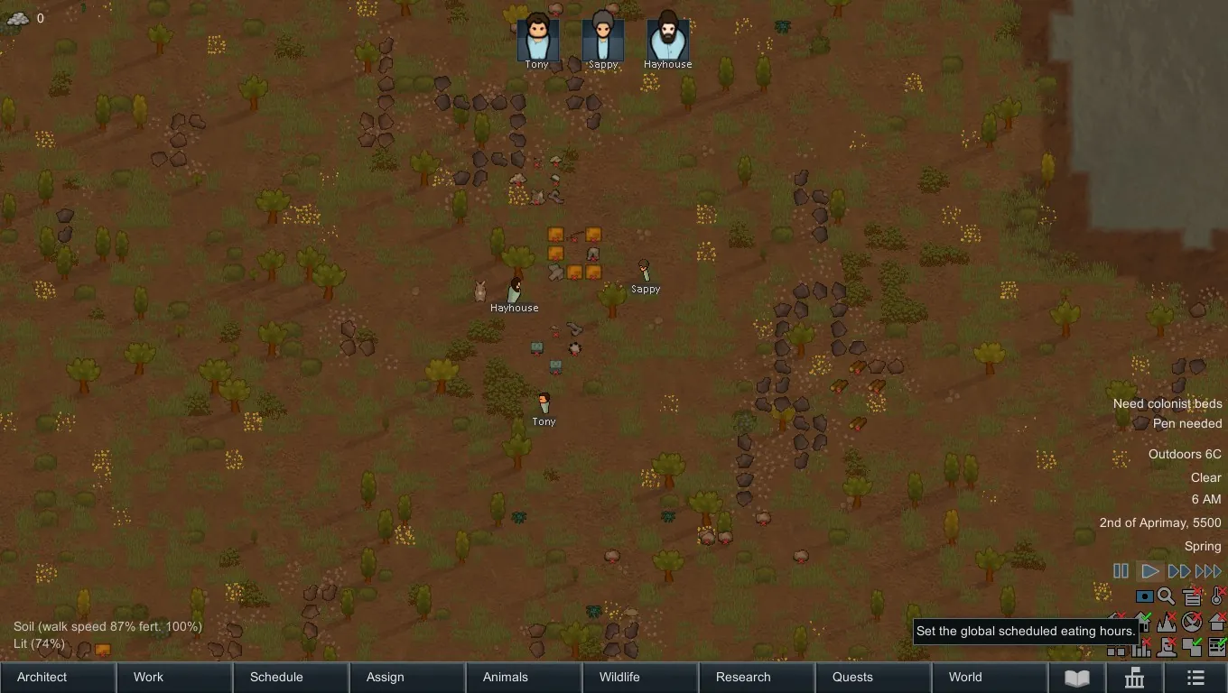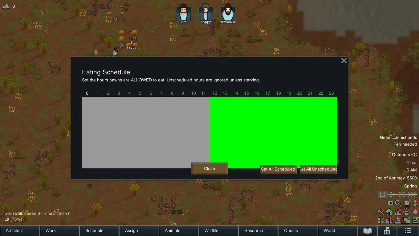 Allows players to schedule the specific hours in the day when pawns are allowed to eat, preventing constant trips to the kitchen outside of designated meal times.