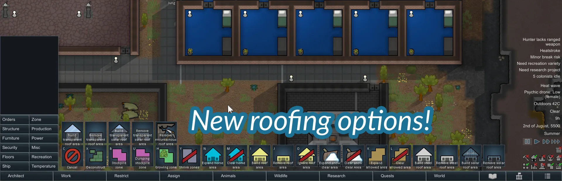 [url=https://steamcommunity.com/sharedfiles/filedetails/changelog/3592101493][img]https://img.shields.io/github/v/release/emipa606/RaiseTheRoof?label=latest%20version&style=plastic&color=9f1111&labelColor=black[/img][/url] | tags: weather protection, infestations