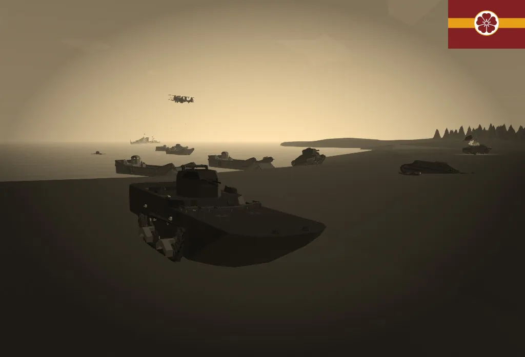 The Sanshōo Amphibious Tank is capable of operating on both land and sea. It is able to discard its floats for greater mobility. The tank has a coaxial machine gun in the turret, along with an additional driver-operated gun for defense (For buoyancy reasons, the second machine gun is not included in the tank), making it quite formidable against soft targets.
