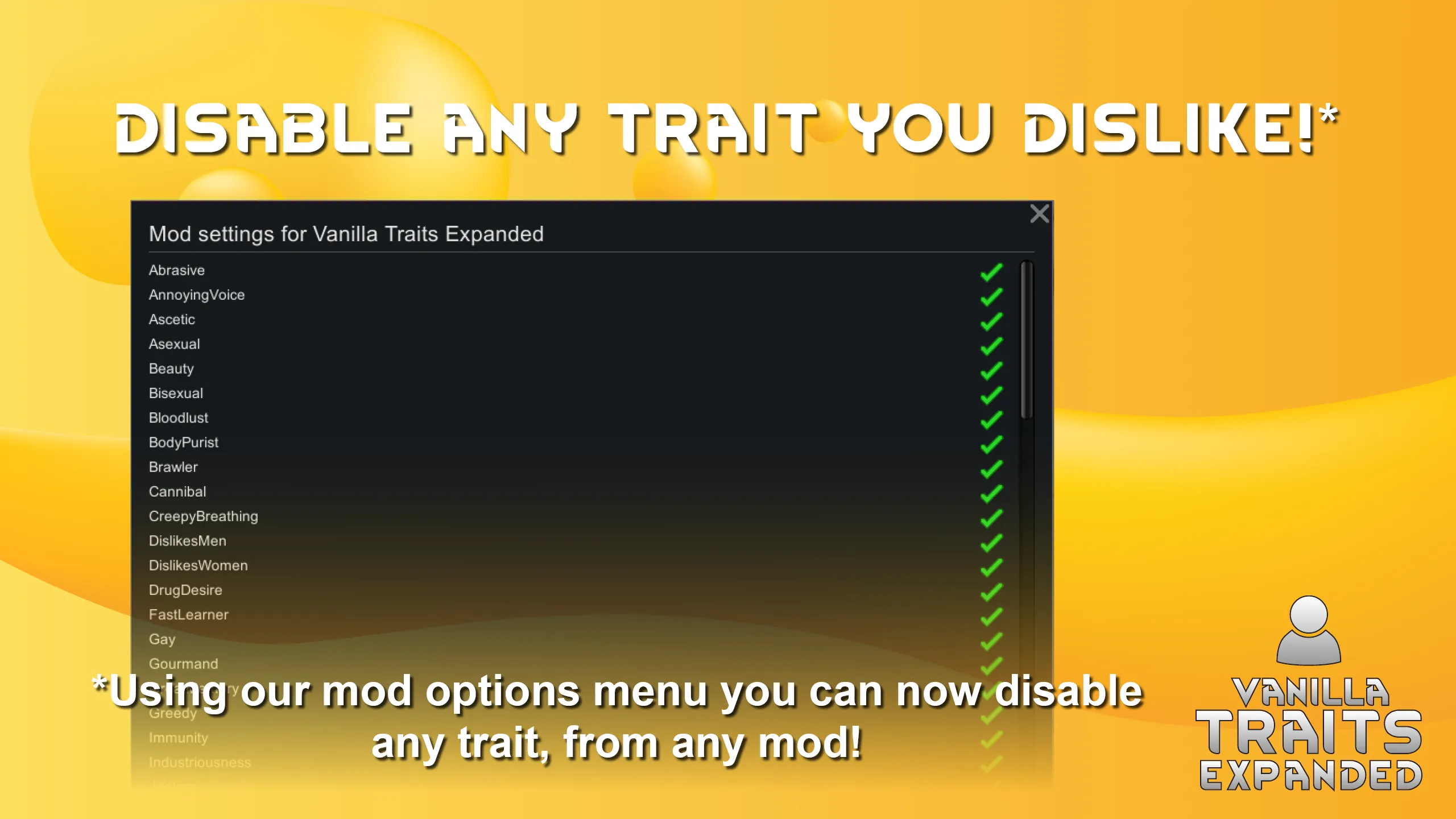 Using our new mod options menu, you can now disable specific traits added by vanilla game or any of the mods you have. This doesn’t mean that the trait will be magically removed from the pawn, but it’s commonality will be reduced to 0, stopping it from ever appearing in the game again.