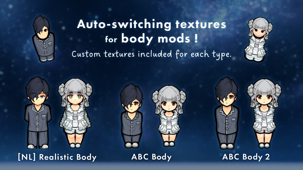 各体型に対応した専用テクスチャを内蔵しており、該当MODが有効になっている場合は自動的に切り替わります。