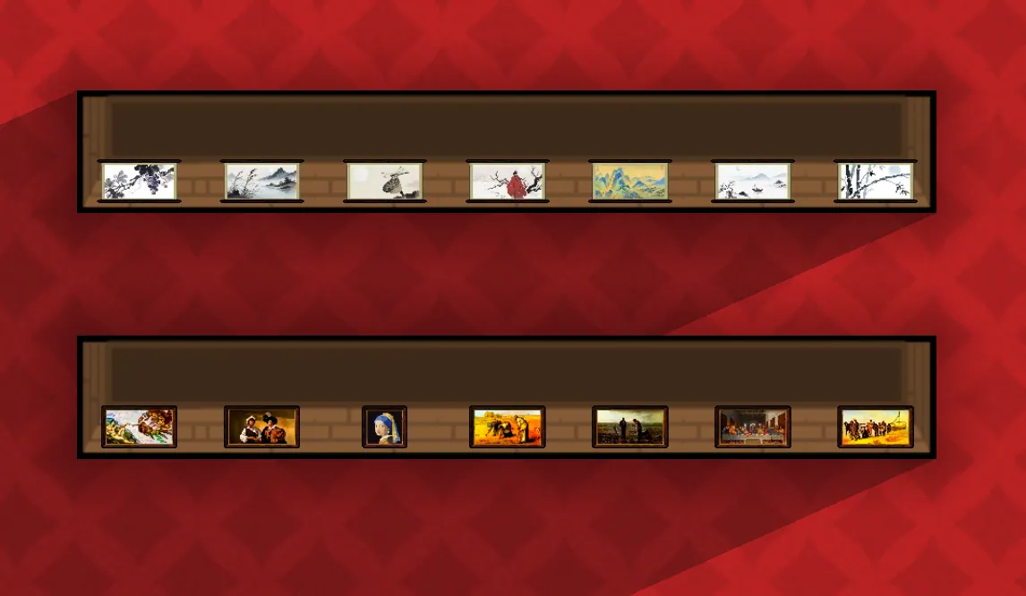 新增了12种不同类型的挂画风格,每种类型也增加了大量的挂画内容,由于代码架构的改变,你存档里的原先的挂画,将会消失并出现无害红字,你可以直接拆掉你的所有画,或者用开发者模式解决!