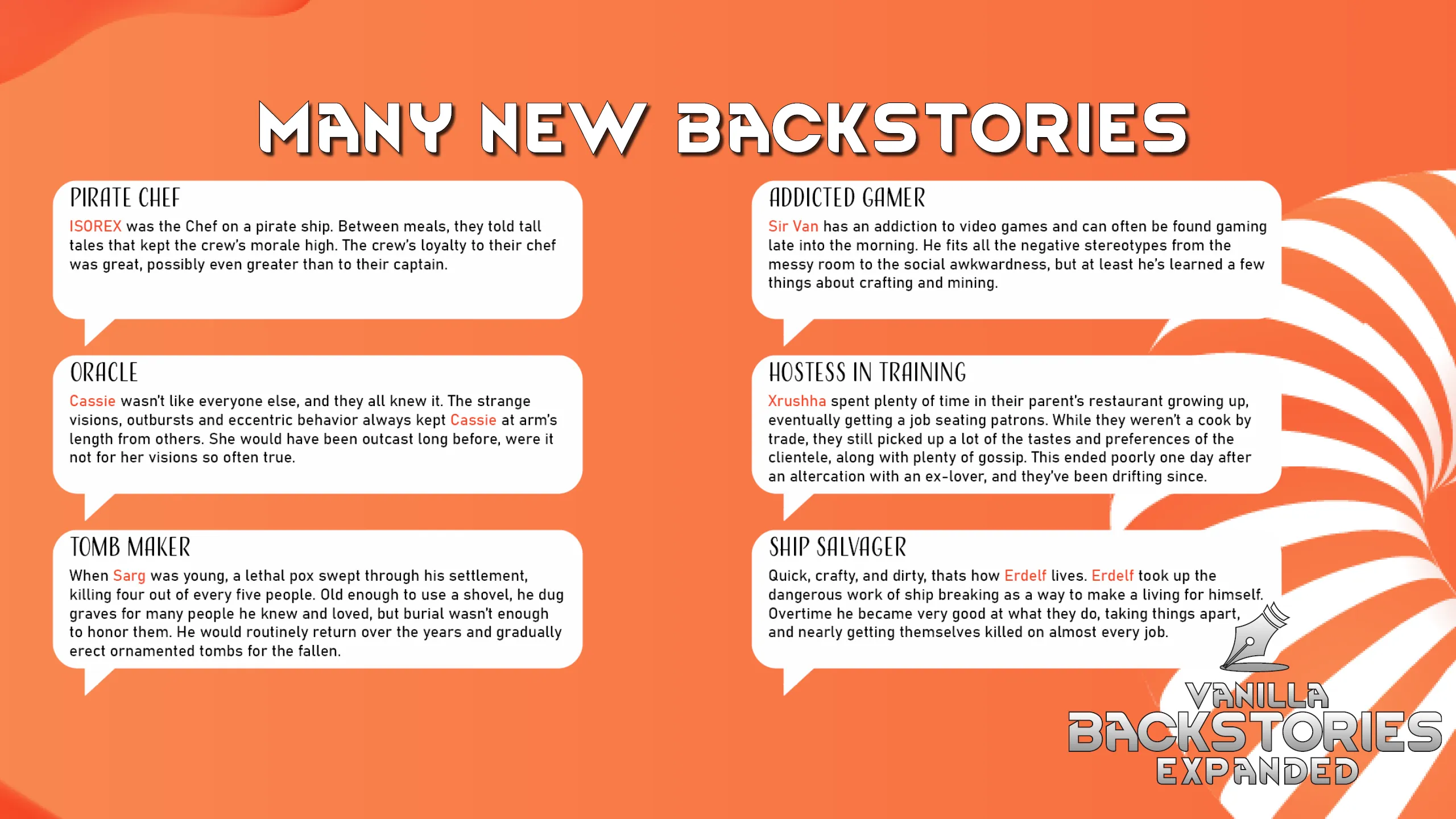 Vanilla Backstories Expanded was a mod suggested by my patrons right after we released Vanilla Backgrounds Expanded and everyone thought that was the mod adding backstories. It wasn’t. This one is.