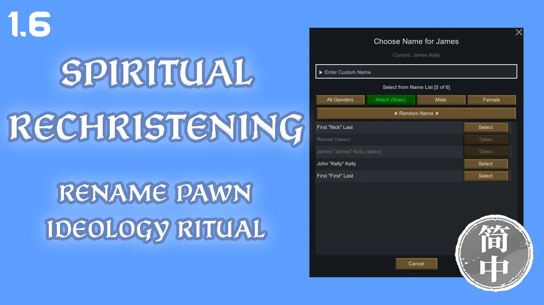 [b] Spiritual Rechristening (Pawn Renaming Ritual) (更名圣礼) 的简中汉化包,请在原mod之后加载。[/b]