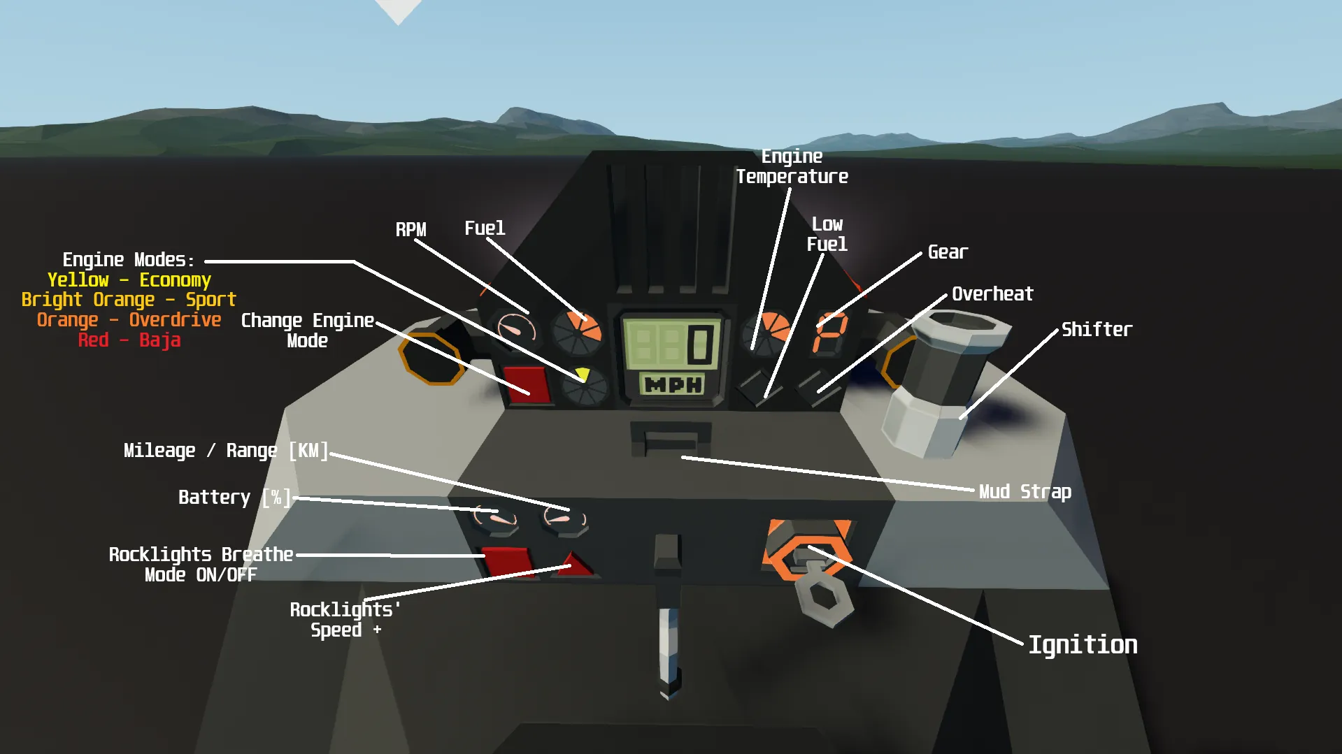 When spawned (unless locked) the ATV will automatically spawn in 'Economy Mode' [Yellow]. To change modes, click the "[b] Change Engine Modes [/b]" button, After one click, you should then be at 'Sport Mode' [Bright Orange]. Click again to go into 'Overdrive Mode' [Dark Orange]. Then, again, to go into the last, and final mode: 'Baja Mode' [Red].