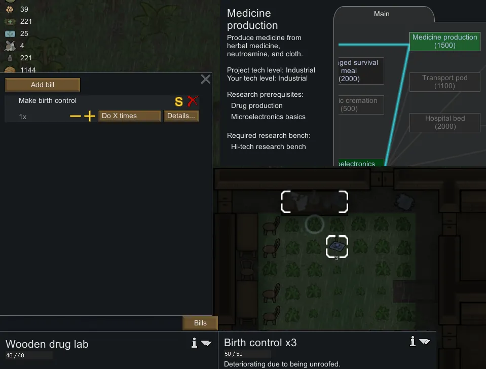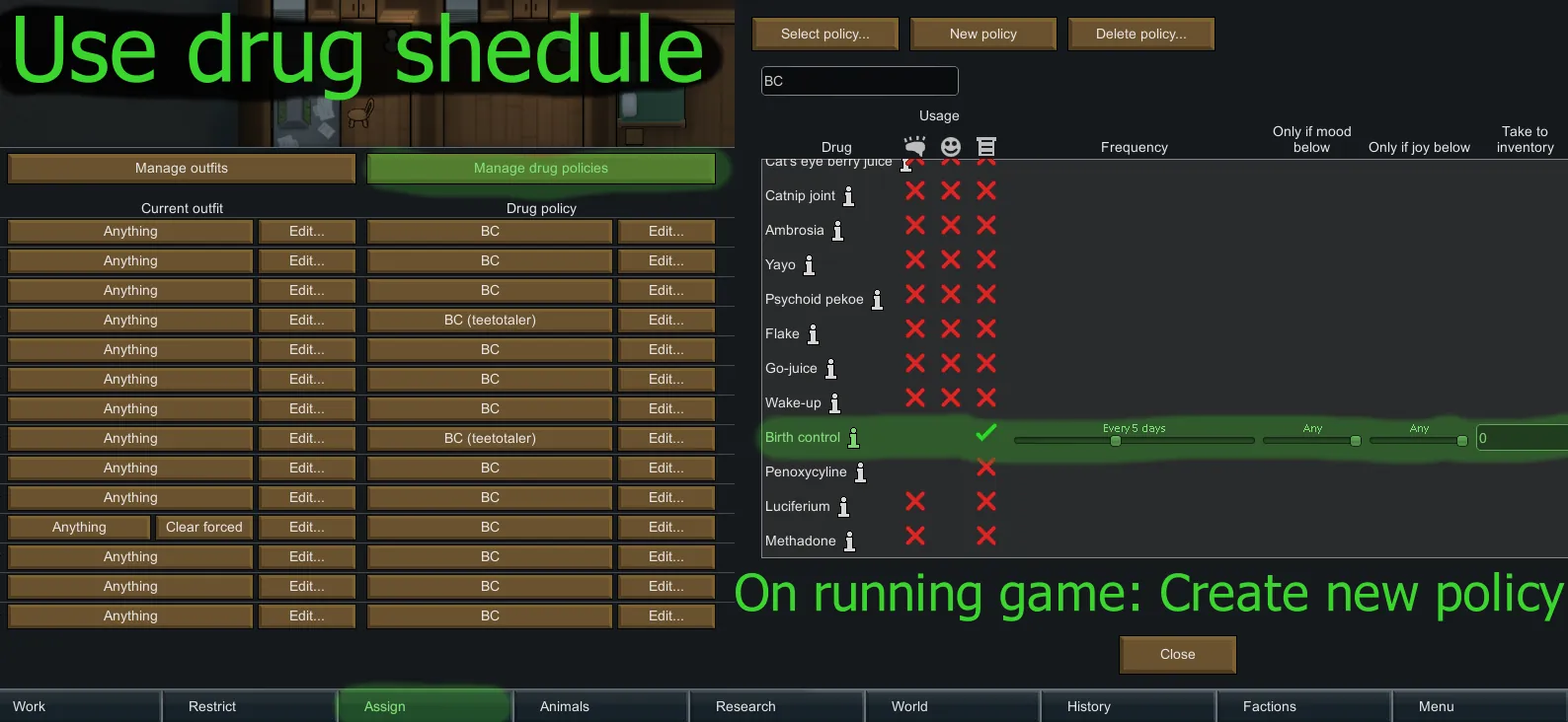 - [i]Birth control 'drug' can be crafted and given a schedule (needs a newly created drug policy in running game to show up, one pill lasts 5 days, can be added with 'Prepare Carefully' under medical, bought or produced with 'Drug production' and 'Medicine production' research in the 'Drug Lab' like medicine)[/i]