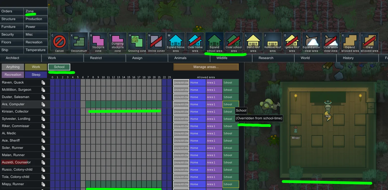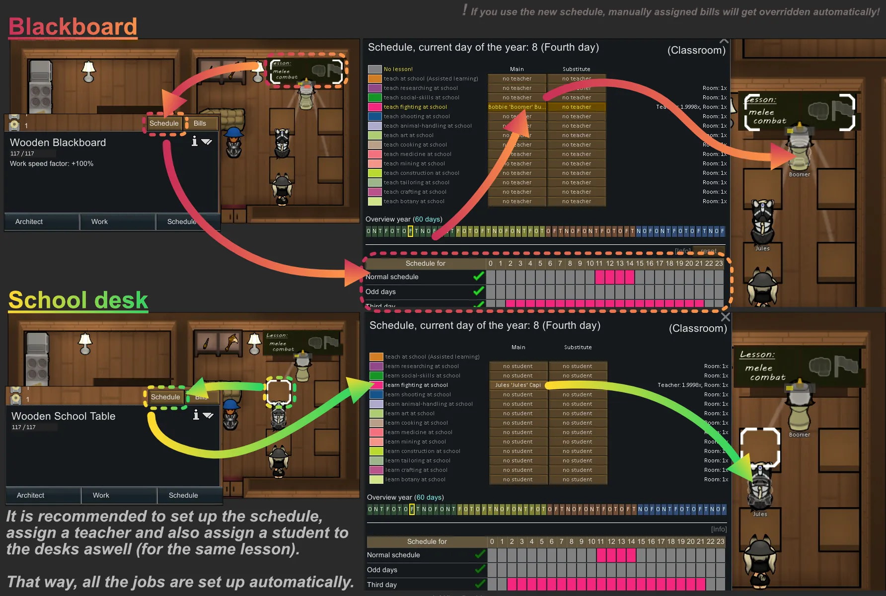 - [b]"GiddyUp!":[/b] Using mounts to ride to school will currently not work when the mount is not within the school-zone already! [i](Colonists may stand still [in shock ;D] until school is over)[/i] You have to set the school-zone/area as forbidden for riding in GiddyUp! for it to work. You can also set a drop-spot outside the zone.