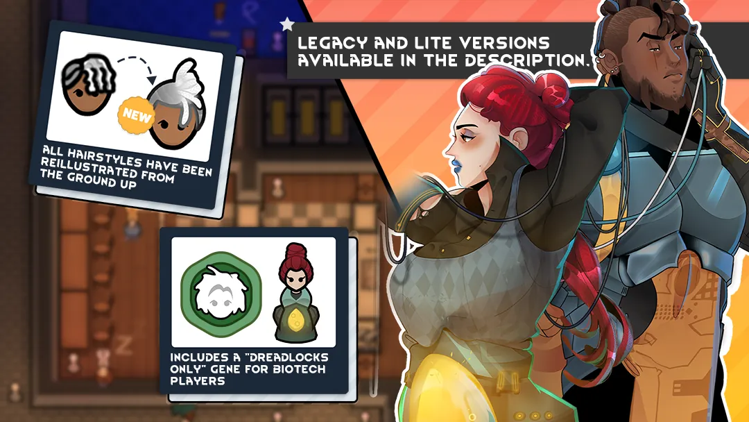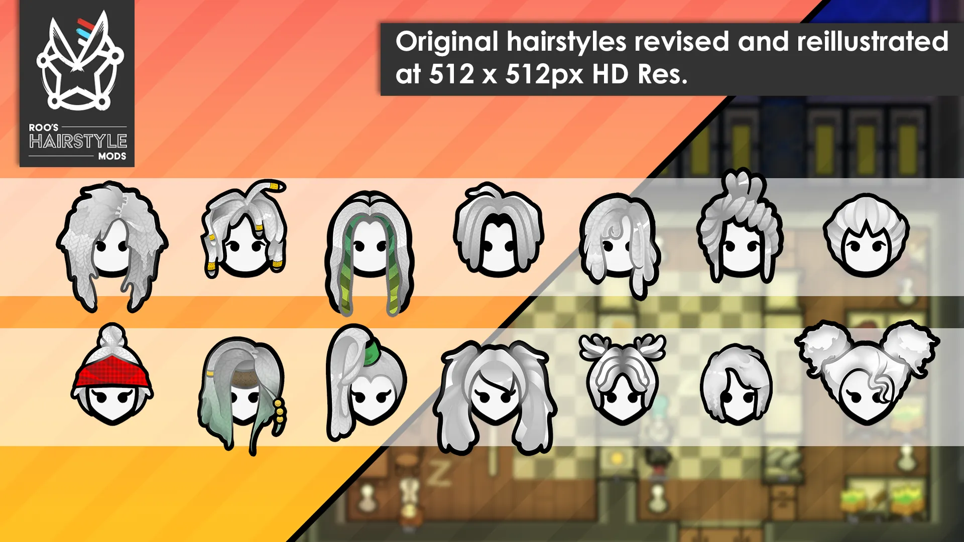 This a HD update of the original [url= https://steamcommunity.com/sharedfiles/filedetails/?id=1972872270]Roo’s Dreadlock Hairstyles Mod[/url], with each hairstyle having been redesigned and scaled to a higher resolution (512 x 512). The hair in this pack ranges from tight dreadlocks to relaxed afros, with an added ‘Dreadlocks only’ gene for Biotech players. This mod still functions perfectly without Biotech.