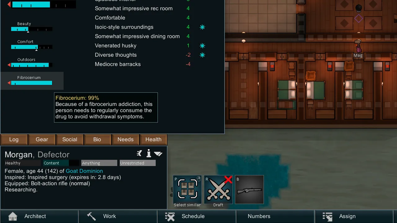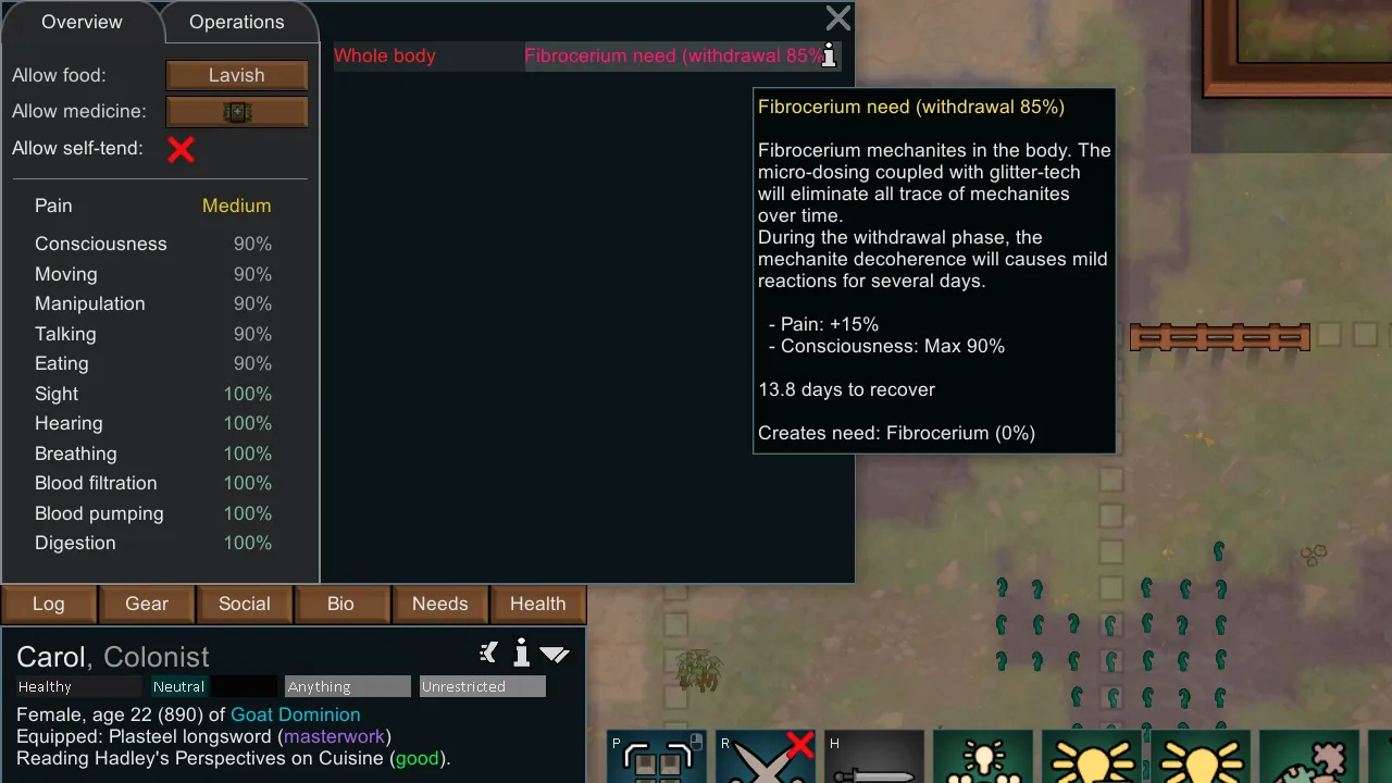 With the addiction comes the need to take fibrocerium. By default, the "Social drugs" drug policy will automatically order the colonist to take one pill of fibrocerium, if it's possible, below the 10% need mark, which is after 27 days of the previous take.