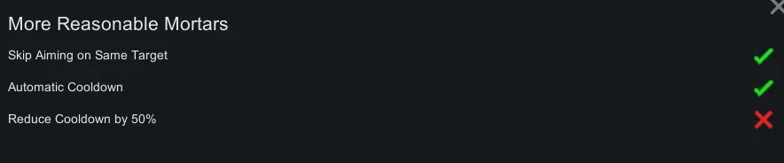 Alright, you think there's no reason for a mortar to take a full 30 seconds to cool down, especially when a skilled crew with a WWII mortar could fire a round every 2 seconds. You can enable this option to double its cooling speed, effectively reducing a vanilla mortar's cooldown to 15 seconds.