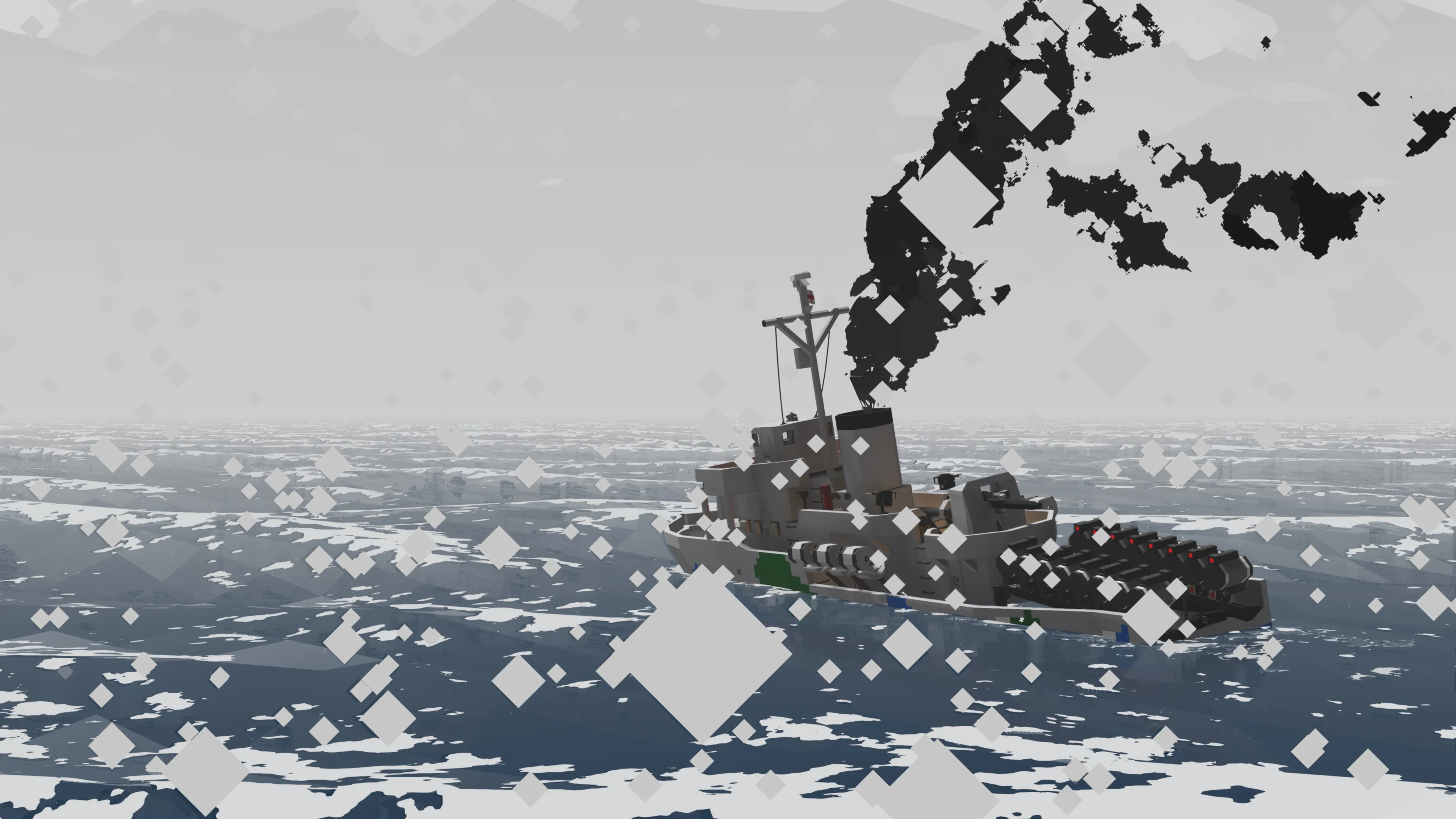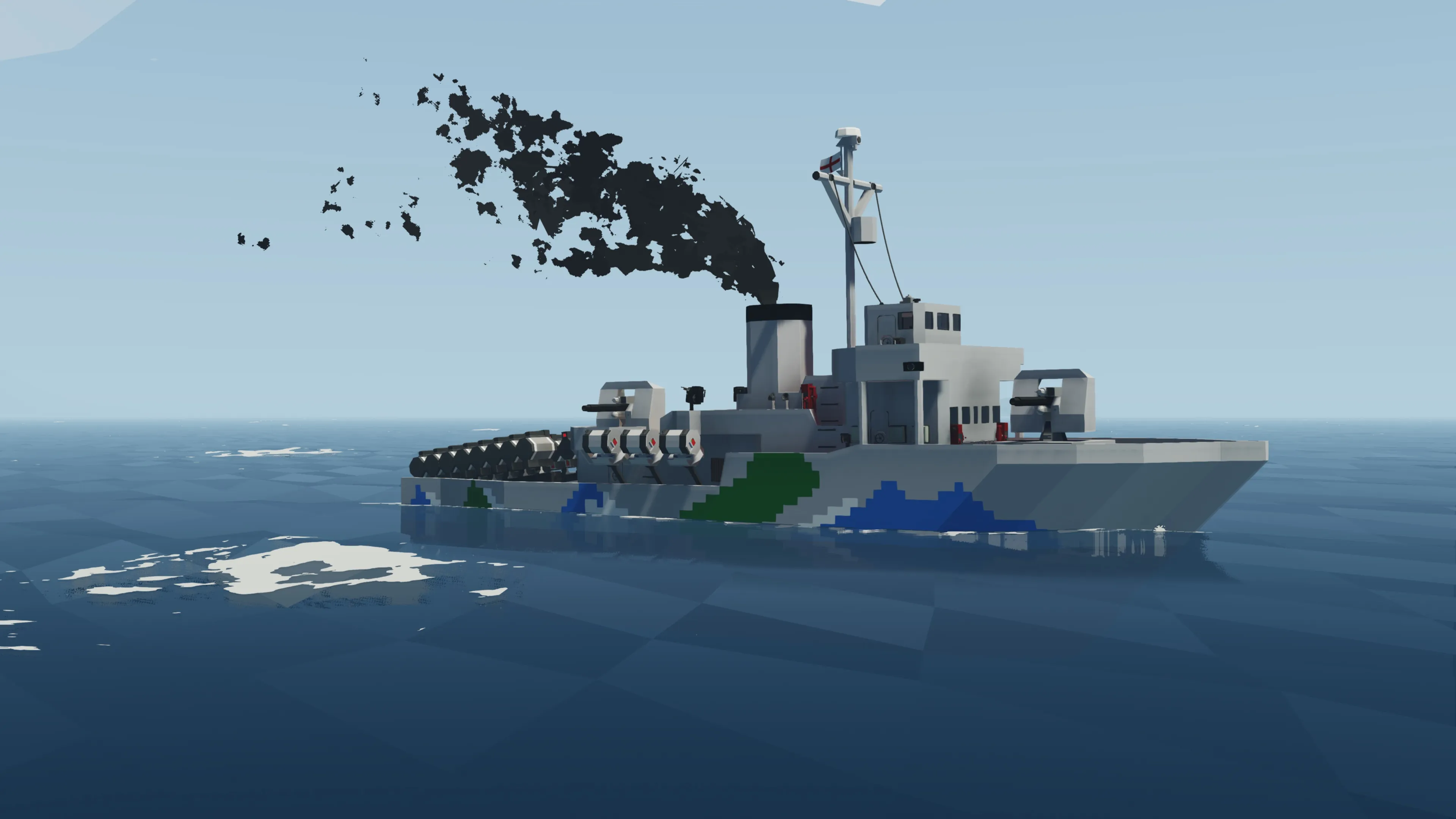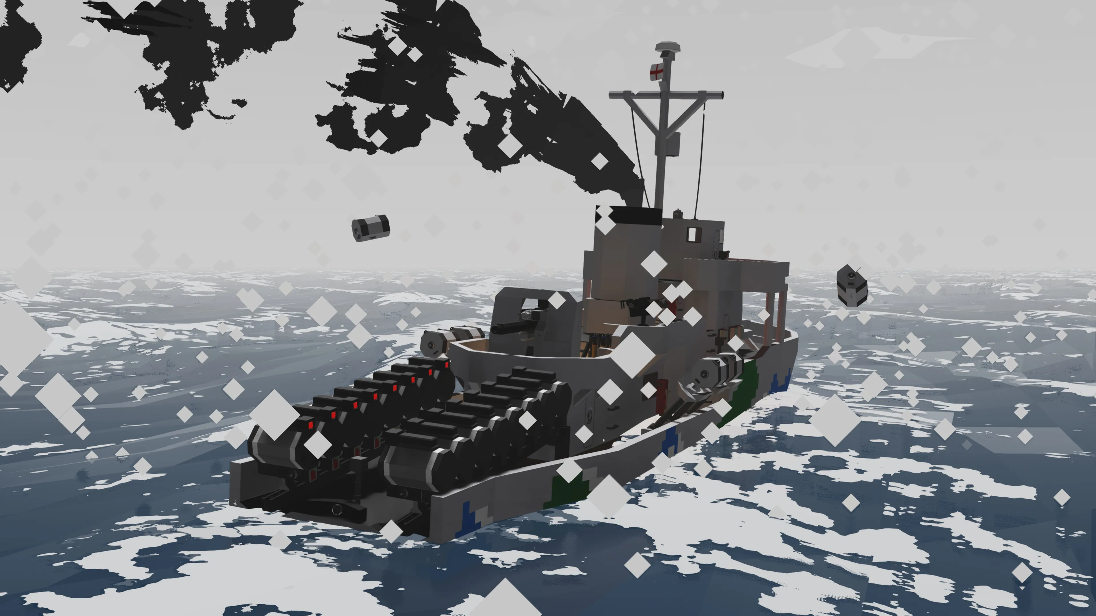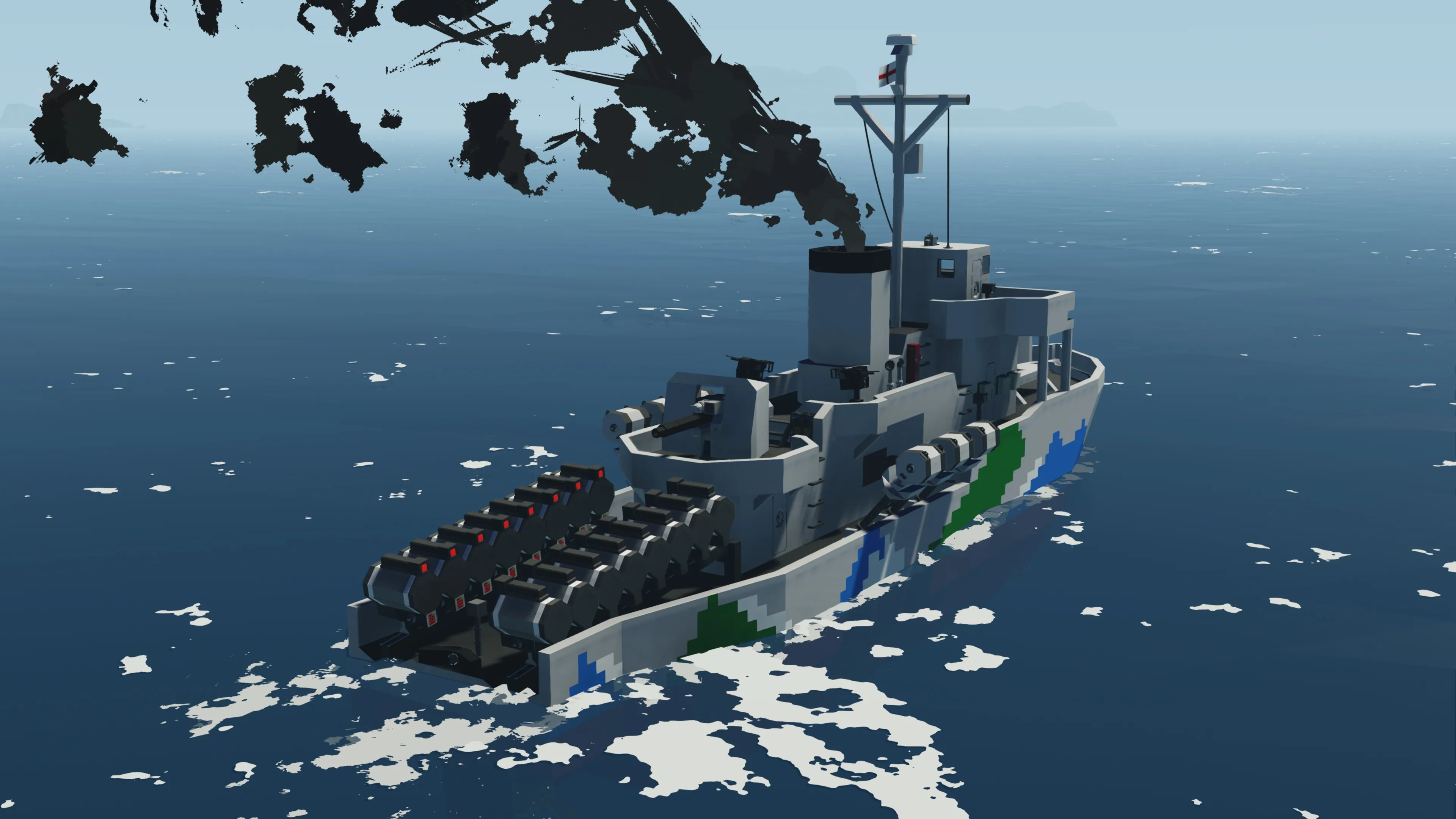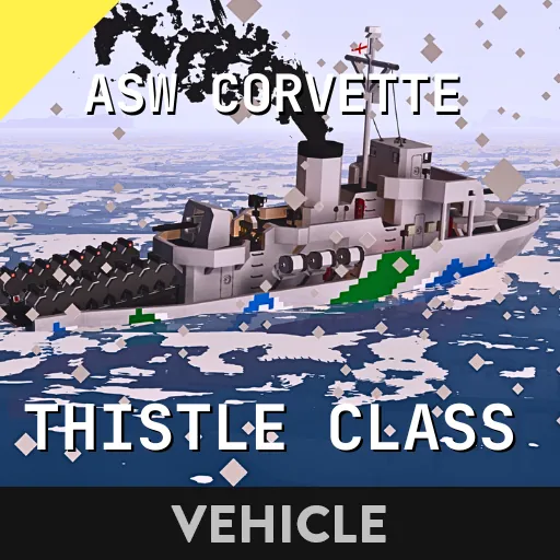 After making my Whuskey diesel submarine I wanted to make a multiplayer capable ASW corvette. This ASW corvette called the Thistle class is loosely inspired by the Flower class corvettes of WWII. She comes equipped with 16 stern dropped depth charges which contain a hefty medium warhead. The depths can be set individually on each depth charge (be sure to use the a negative value for depth like -20 for 20m depth when entering in the keypad). The corvette is also equipped with 6 side launchers for depth charges that can be adjusted for depth. These have small warheads.