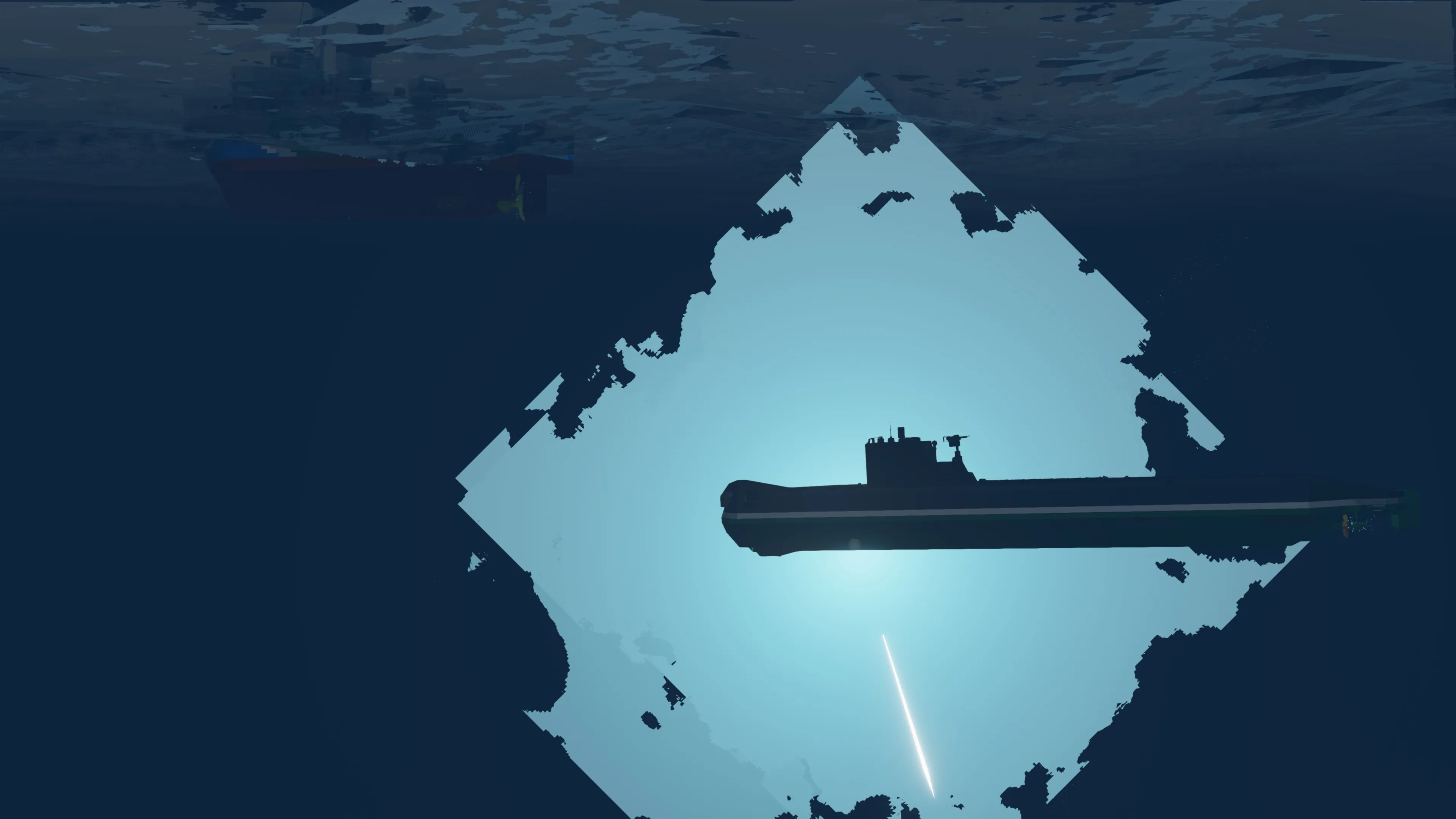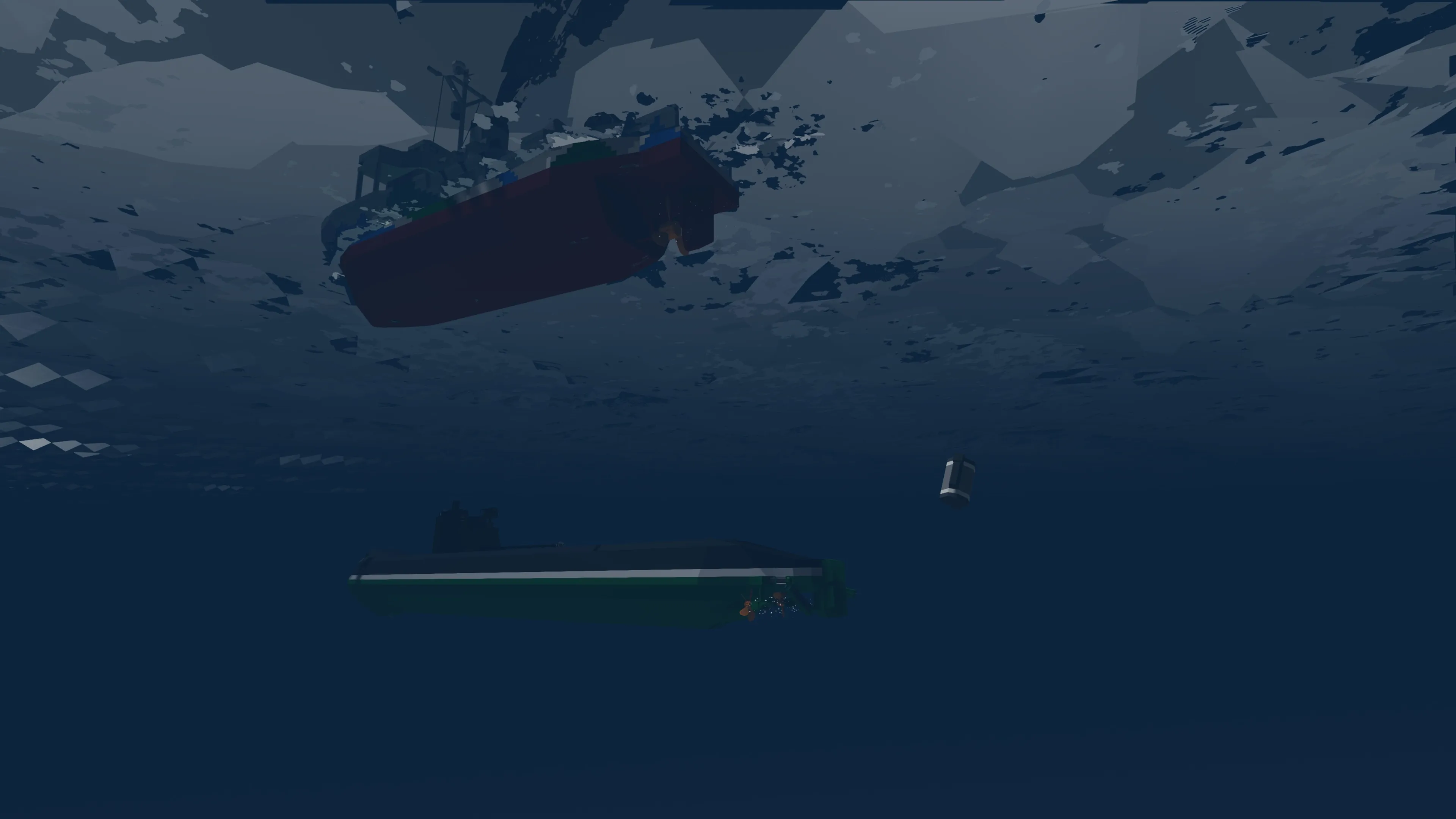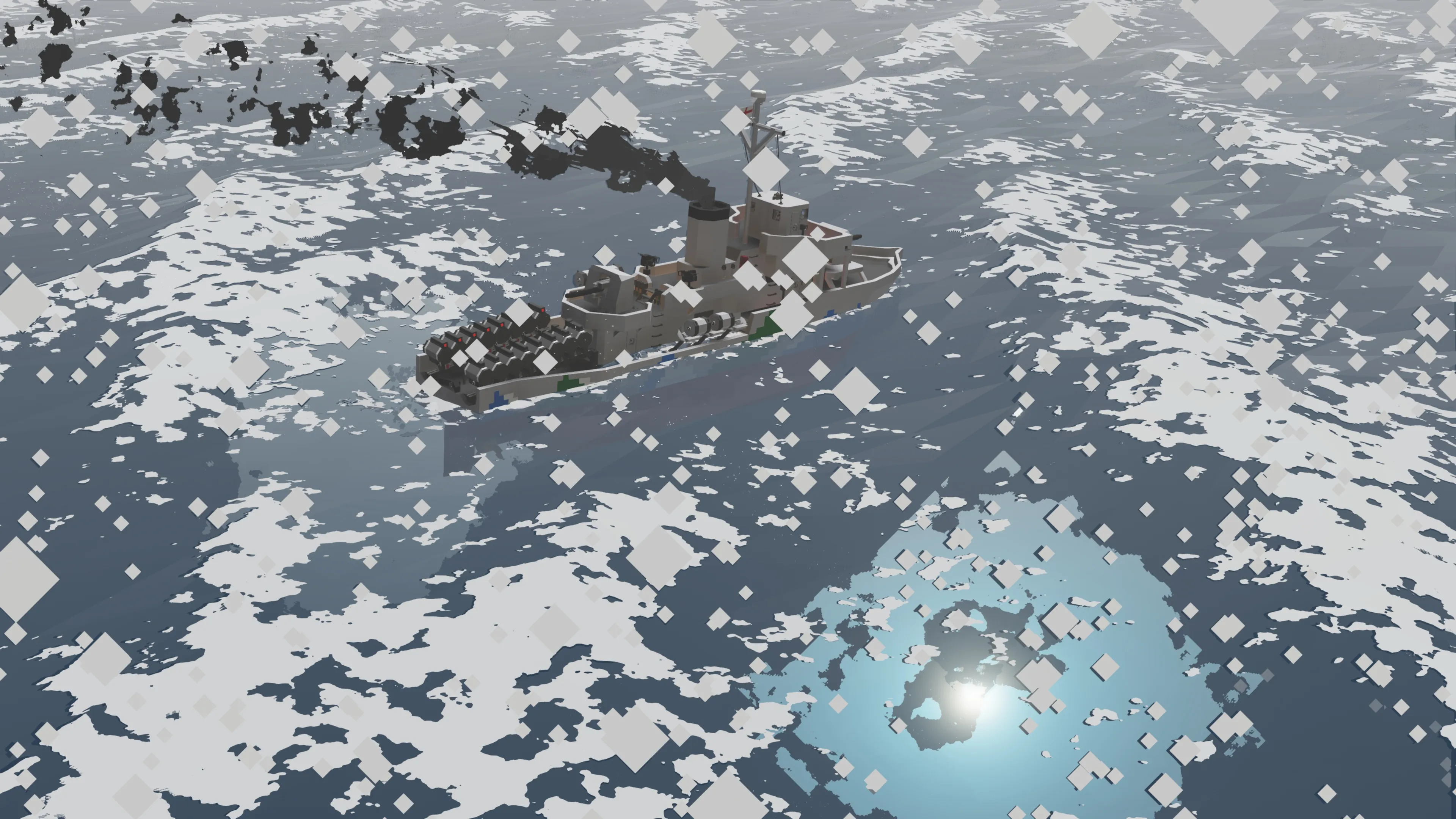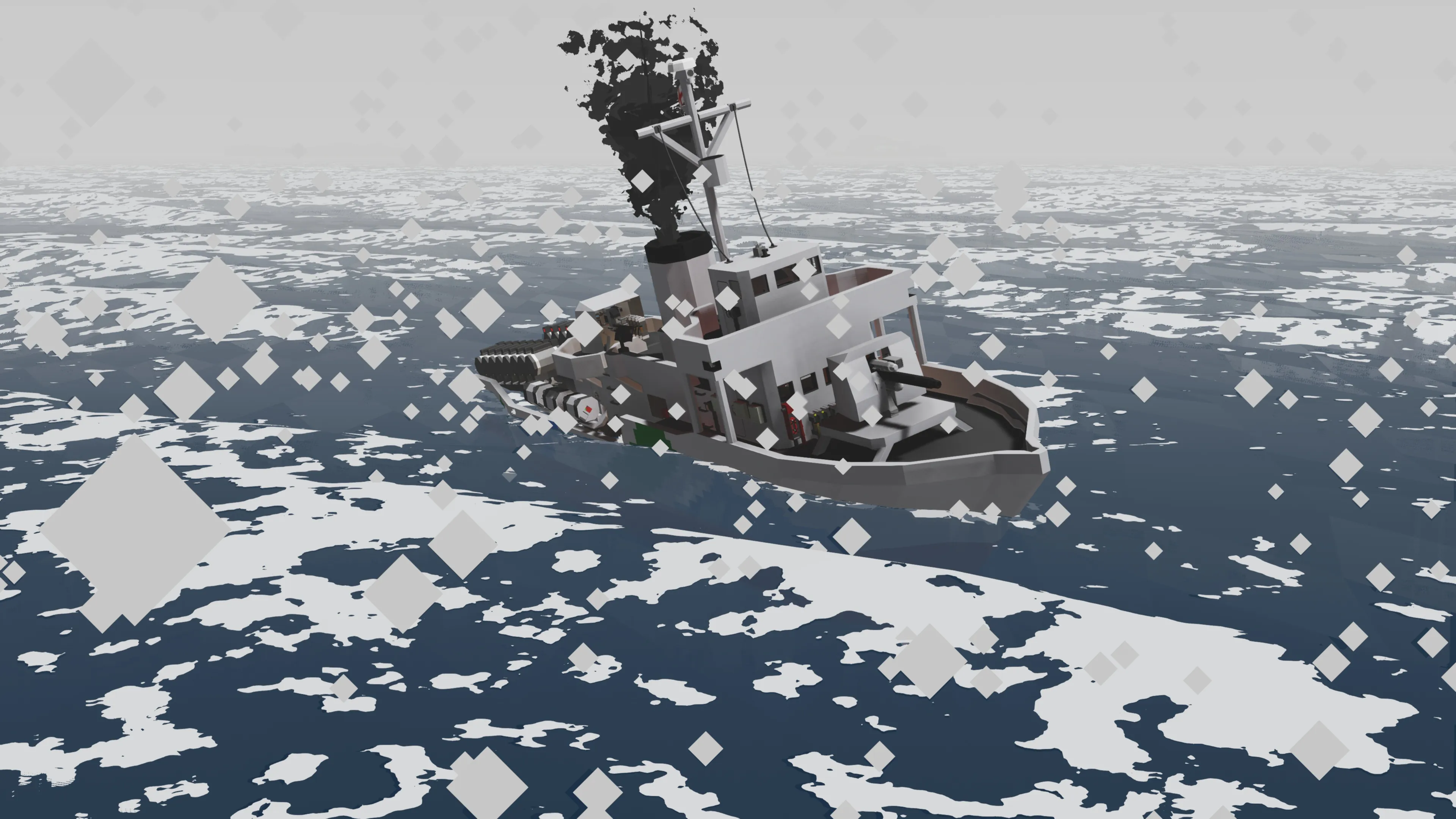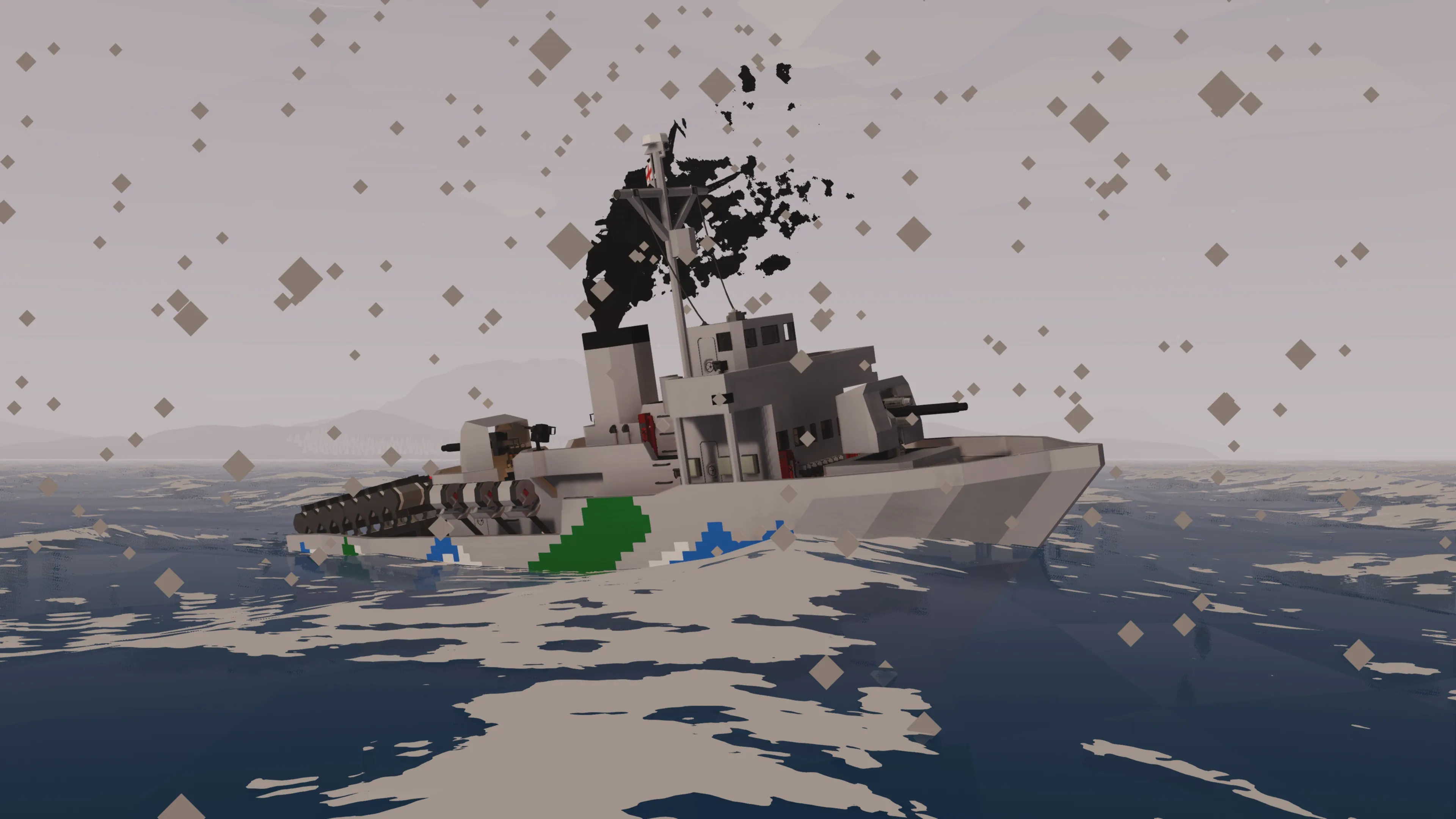 After making my Whuskey diesel submarine I wanted to make a multiplayer capable ASW corvette. This ASW corvette called the Thistle class is loosely inspired by the Flower class corvettes of WWII. She comes equipped with 16 stern dropped depth charges which contain a hefty medium warhead. The depths can be set individually on each depth charge (be sure to use the a negative value for depth like -20 for 20m depth when entering in the keypad). The corvette is also equipped with 6 side launchers for depth charges that can be adjusted for depth. These have small warheads.