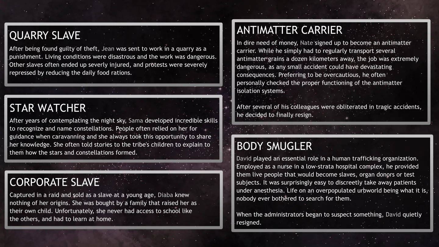 This mod is a collection of various backstories all written by me. It adds 137 new ones. More will be written and added in future updates as time goes on.