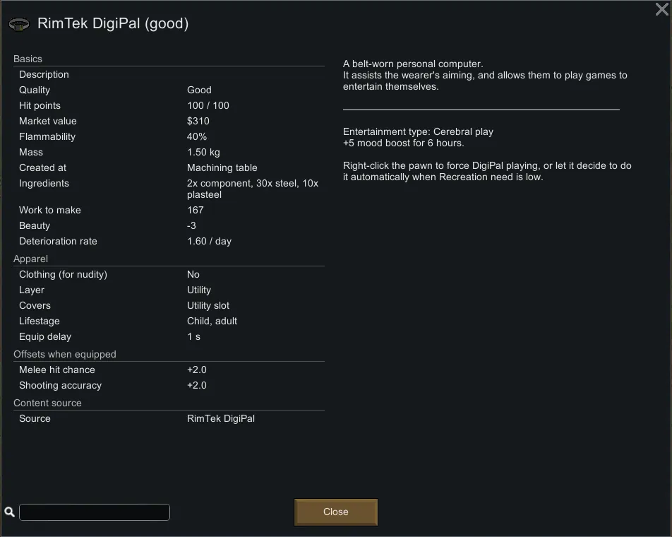 The mod adds a belt with a personal computer (RimTek DigiPal) that increases wearer's melee and ranged accuracy. It also allows them to play games (cerebral play) when relaxing and looking for recreation.