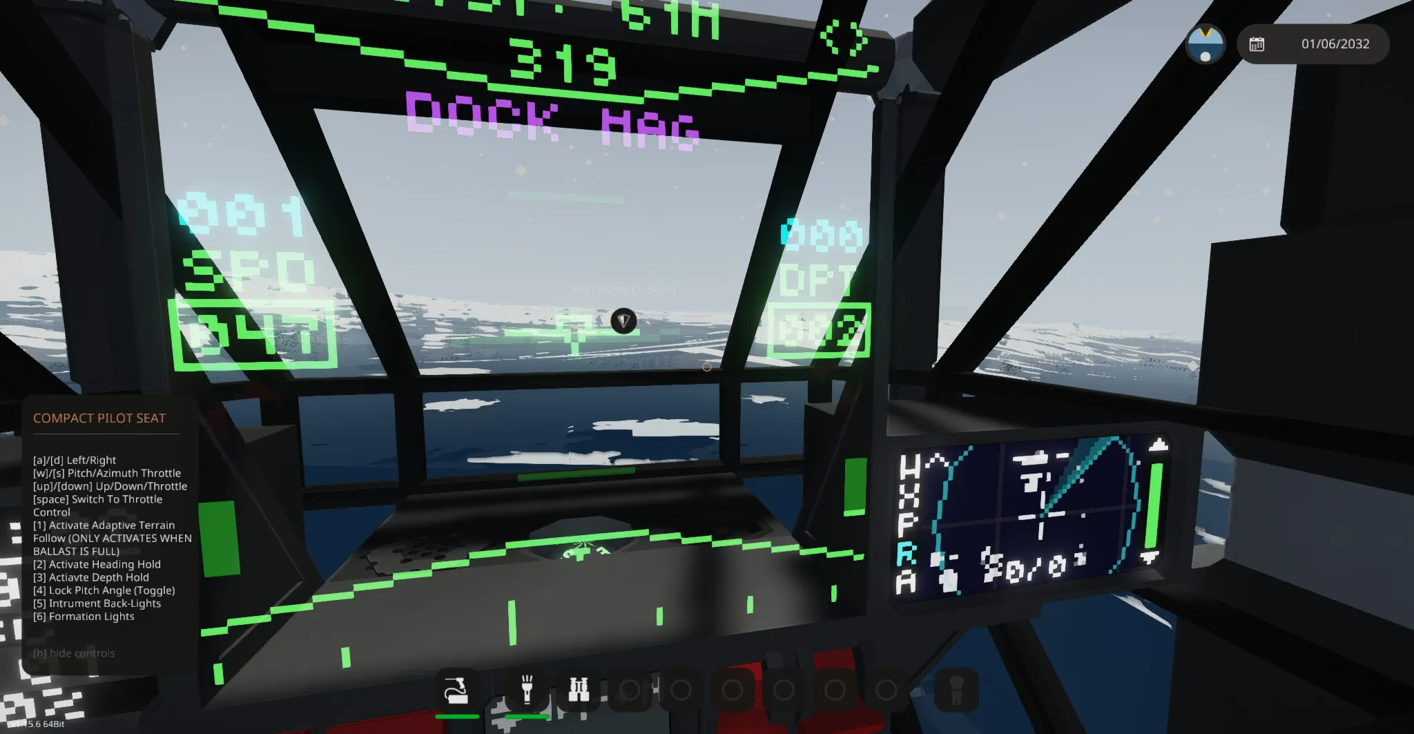 [b][Hotkey 1][/b] Enables Adaptive Terrain Following Depth Hold which will only activate when the ballast is above 3800 liters. Hotkey 1 holds the sub at a set depth, but unlike the other depth holds, it will conform to the terrain.