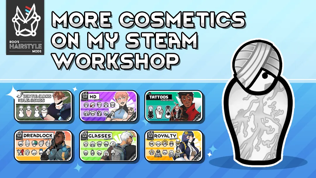 A. Hairstyles like “Eye Scar” and “Sunglasses” don’t really fit in this mod anymore, as facial blemishes can now be found in [url=https://steamcommunity.com/sharedfiles/filedetails/?id=2890180936]Roo’s Birthmarks and Blemishes[/url], and glasses can be found in [url=https://steamcommunity.com/sharedfiles/filedetails/?id=2869561673]Roo’s HD Glasses Hairstyles[/url].