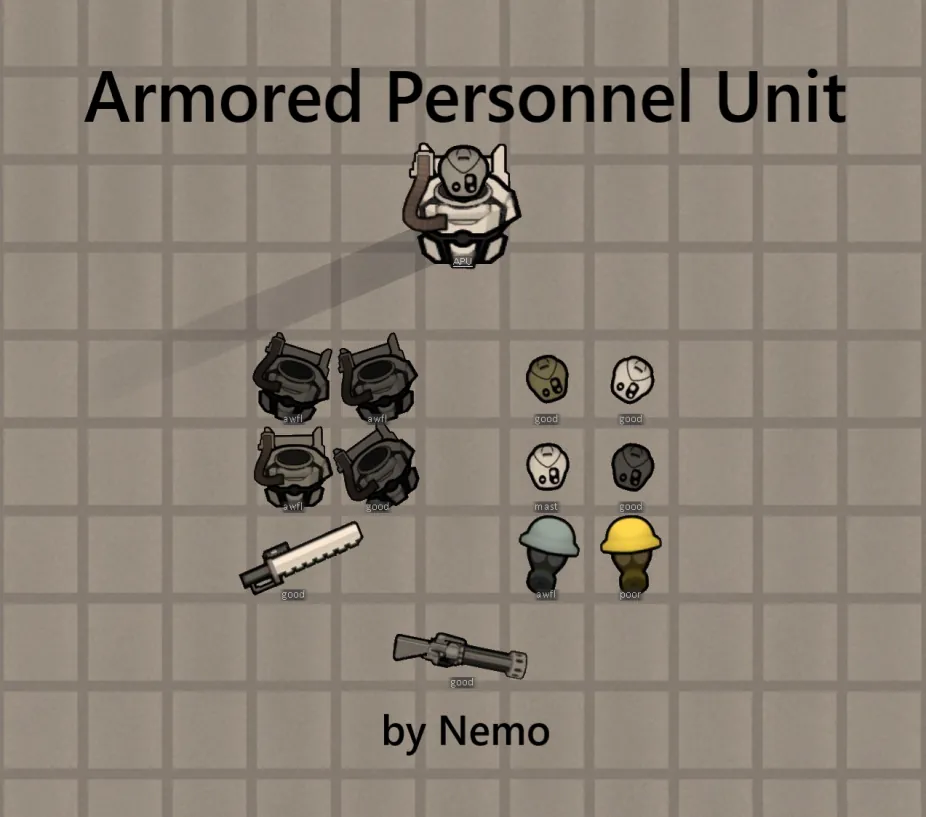 This mod adds a reinforced gas mask, a new type of power armor: an Armored Personnel Unit and two weapons that can be used effectively with it.