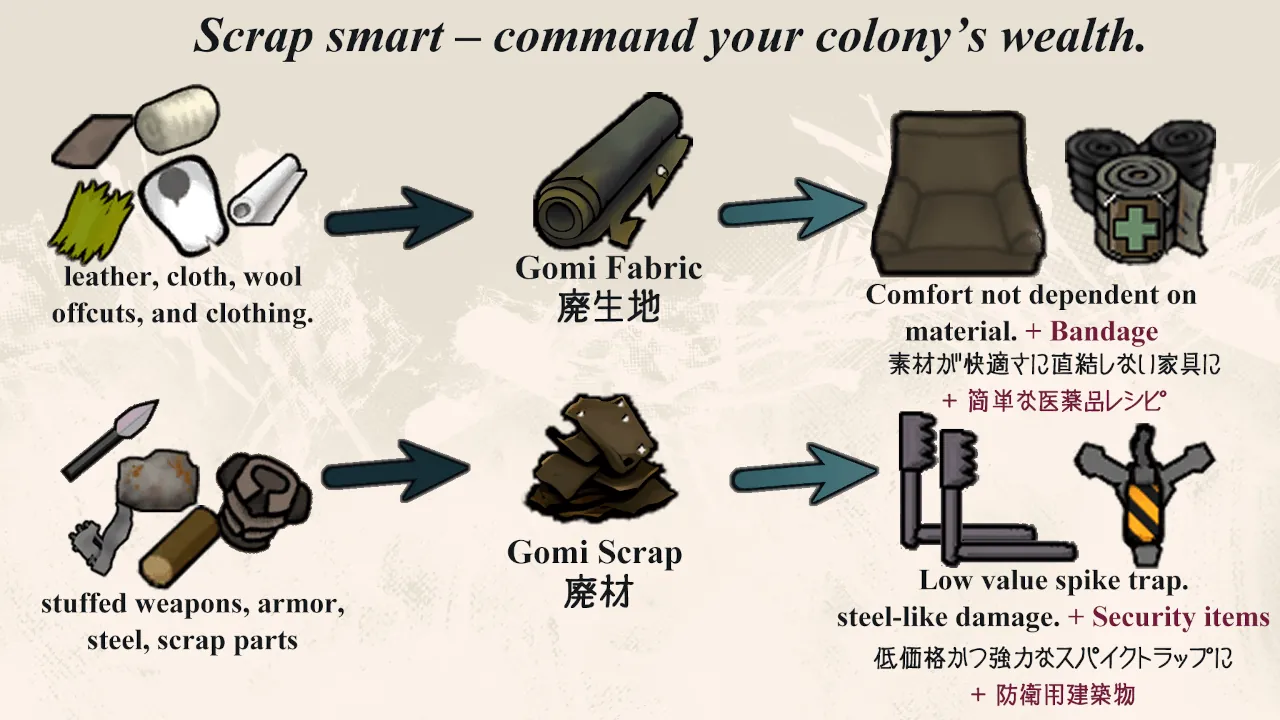- **Crafting support**: Recycle cloth, leather, hay, and refuse into functional materials.
