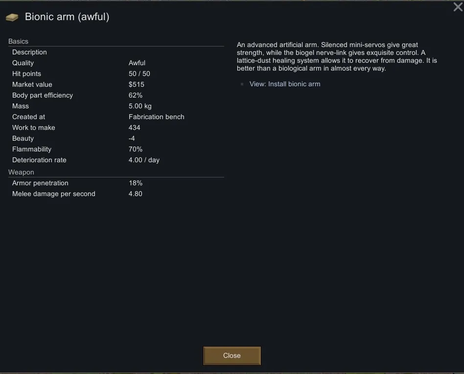 Prostheses of a certain tech level and above (adjustable from the mod menu) now have quality levels that affect the efficiency of the part. because lets face it, someone had to have figured out a way to make a circuit in the unit a little bit better.