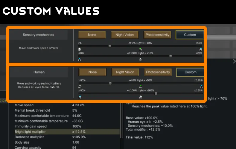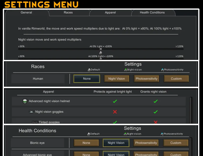 [*] Customisable settings for any bionics or health conditions that effect the eyes (e.g. remove night vision from bionic eyes, or make luciferium even more potent with a custom buff in both bright light and darkness)