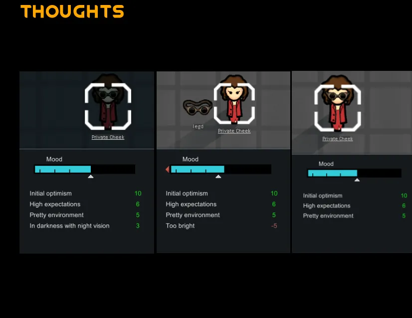 [*] [b]Default (vanilla):[/b] Work and move [u]20% slower[/u] in complete darkness. [u]Negative[/u] thoughts in darkness.