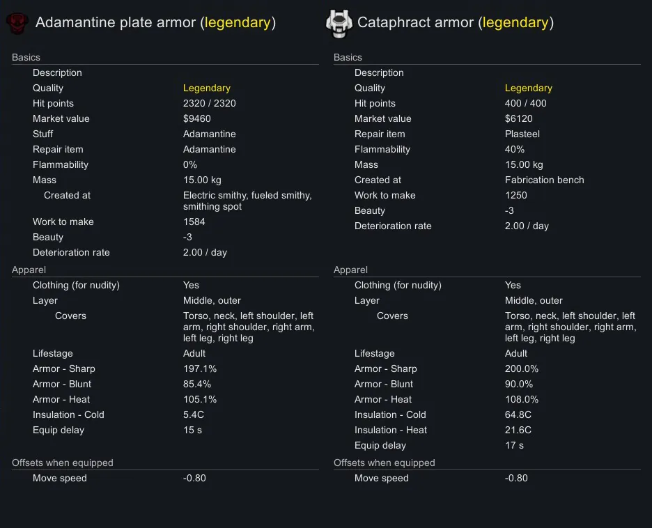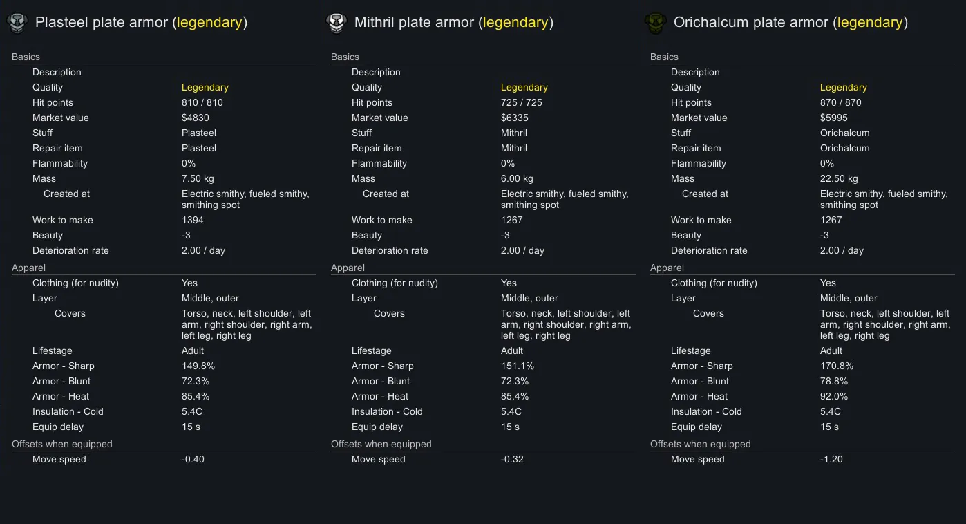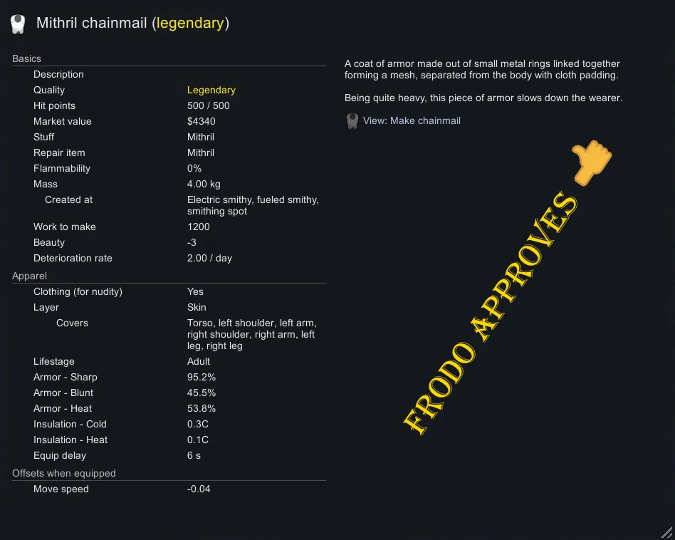 I also recommend using [url=https://steamcommunity.com/sharedfiles/filedetails/?id=2787438435]Stuff Mass Matters[/url] mod so that for example a mithril chainmail actually weighted less and had lesser movement speed penalty.