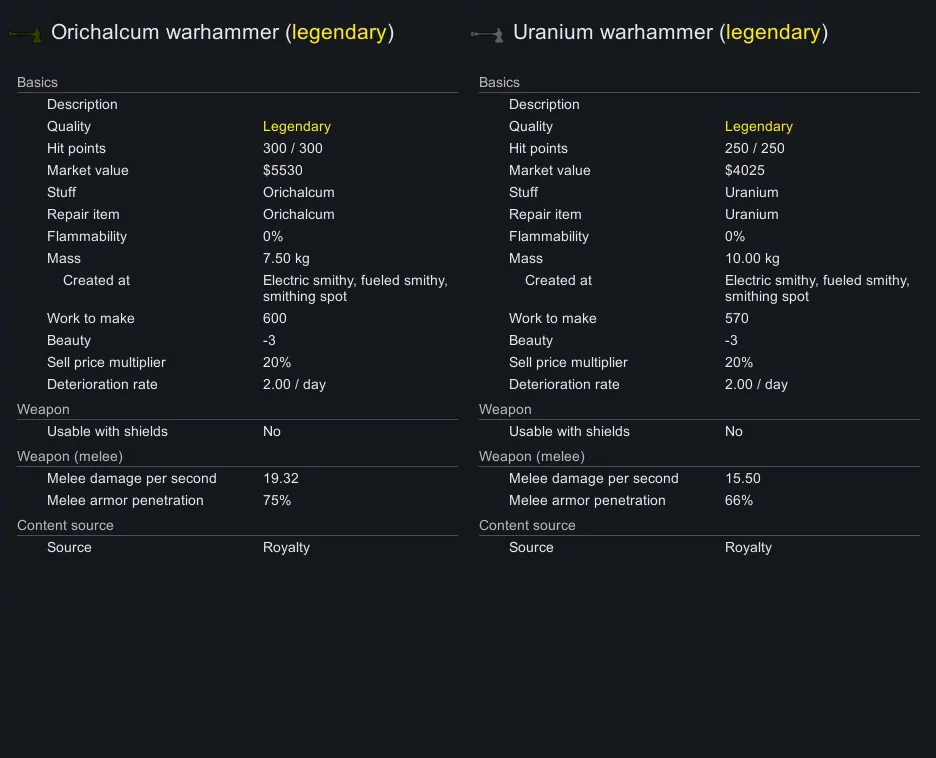 Removed. At first, I thought of making it into a niche metal for blunt resistant armor but after some consideration decided against it. I honestly can’t think of a situation when it’s better to trade sharp armor for blunt, and even if such situation can exist it’s not worth it. Creating separate sets of armor, changing it for you pawns before battle, and not to mention the amount of wealth this armor will add… Then I though of maybe using it as even stronger and rarer version of adamantine, something like the ultimate armor material with both good sharp and blunt resistances, but again decided against it because it will make adamantine into just another bloat material. So, I decided to remove it too, and, to be fair, you can hardly call vibranium a “fantasy” metal.