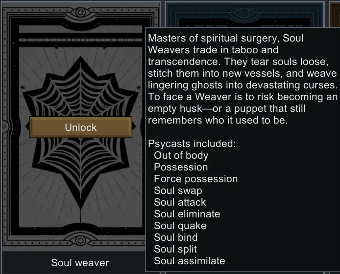 Soul Weavers are psycasters who walk the line between life and death, bending the spirit itself into weapon and veil. They can evict a soul from its flesh, wear another's body like a second skin, or unravel an enemy's psyche with a whisper.As masters of spiritual surgery, Soul Weavers trade in taboo and transcendence. They tear souls loose, stitch them into new vessels, and weave lingering ghosts into devastating curses. To face a Weaver is to risk becoming an empty husk—or a hollow puppet.