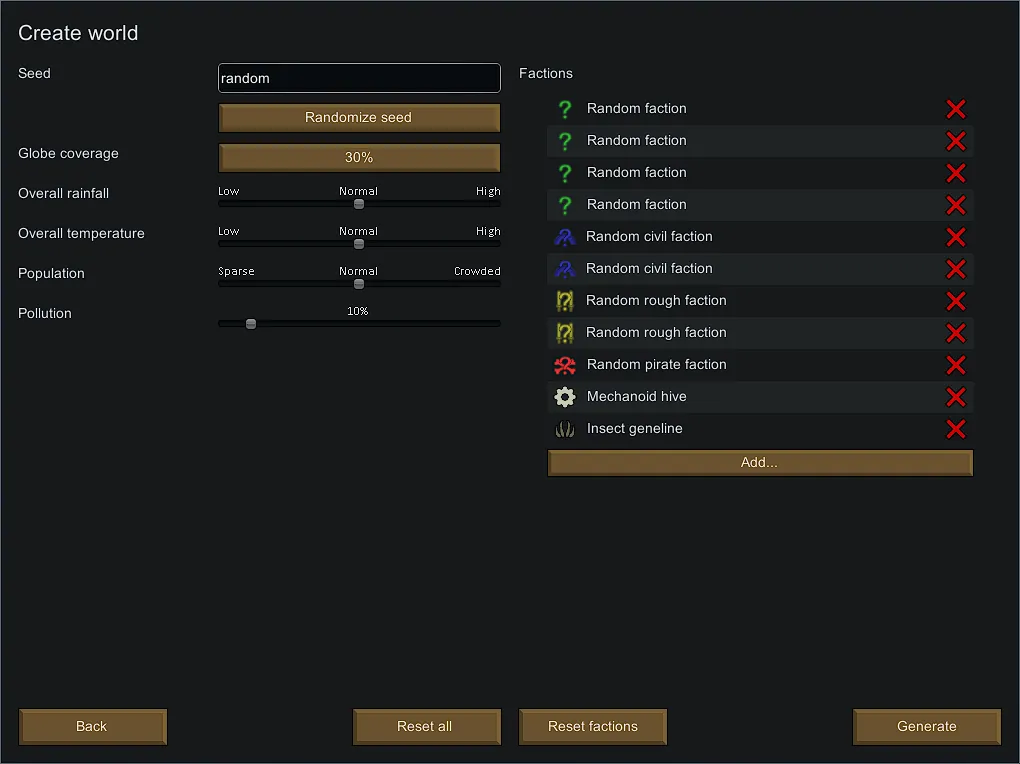 Random factions adds 4 placeholder factions (see below), each of which is randomly replaced with another faction. Dr. Plantabyte personally recommends 4 random, 2 civil, 2 rough, and 1 pirate factions, plus 1 each of Mechanoid hive and Insect geneline, but you can do any combination you want.