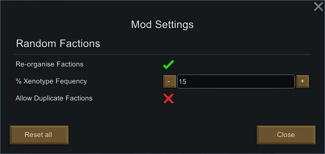 * [b]Re-organize Factions:[/b] If checked, then the New Colony screen will start with only random factions instead of standard factions (checked by default)