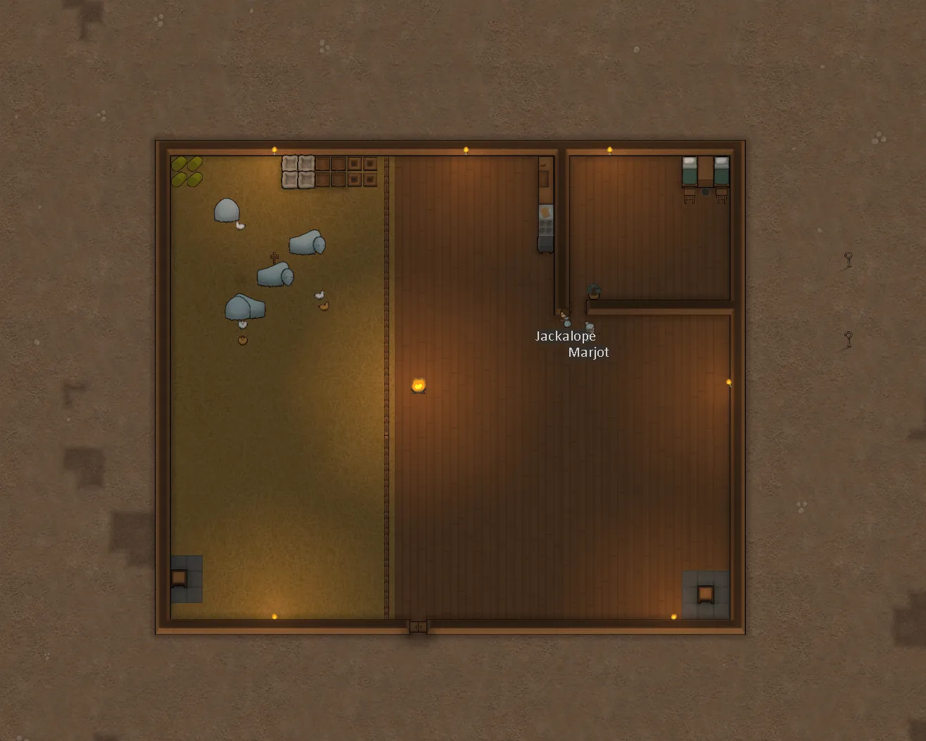 A farmhouse standing on a grassless plain. Inside is a bedroom with two comfortable beds, nightstands, and two rifles with infinite ammo. Outside the bedroom are a butcher table and a cooking stove.