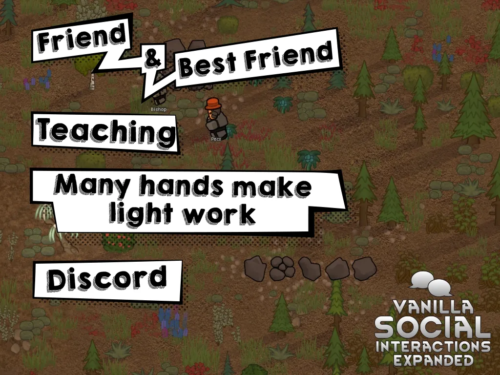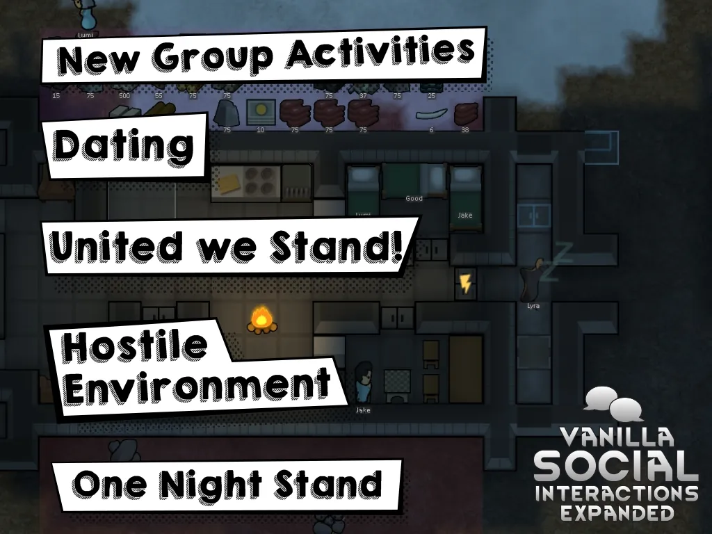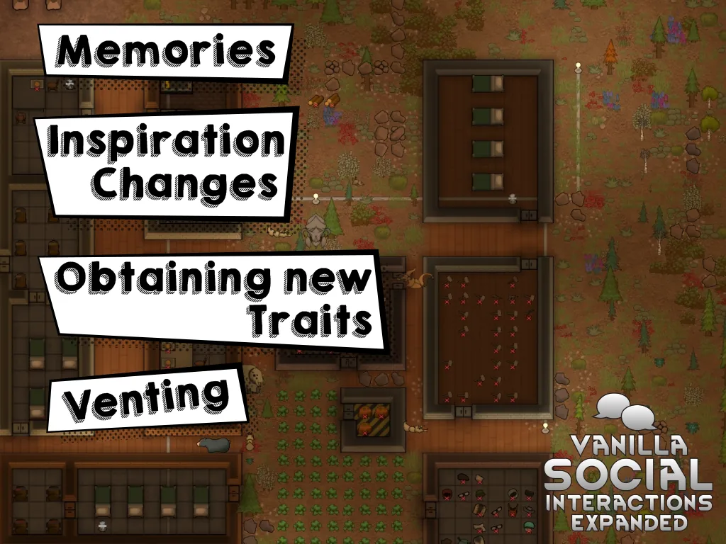 Vanilla Social Interactions Expanded means to bring much more needed life to your pawns and interactions they have. This mod alters what pawns do in their spare time, puts some extra emphasis on relations tab and adds many mechanics that breathe fresh air into otherwise boring and stale game. Pawns now also have aspirations that can be fulfilled to gain powerful mood buffs, and the whole inspiration system is also changed.