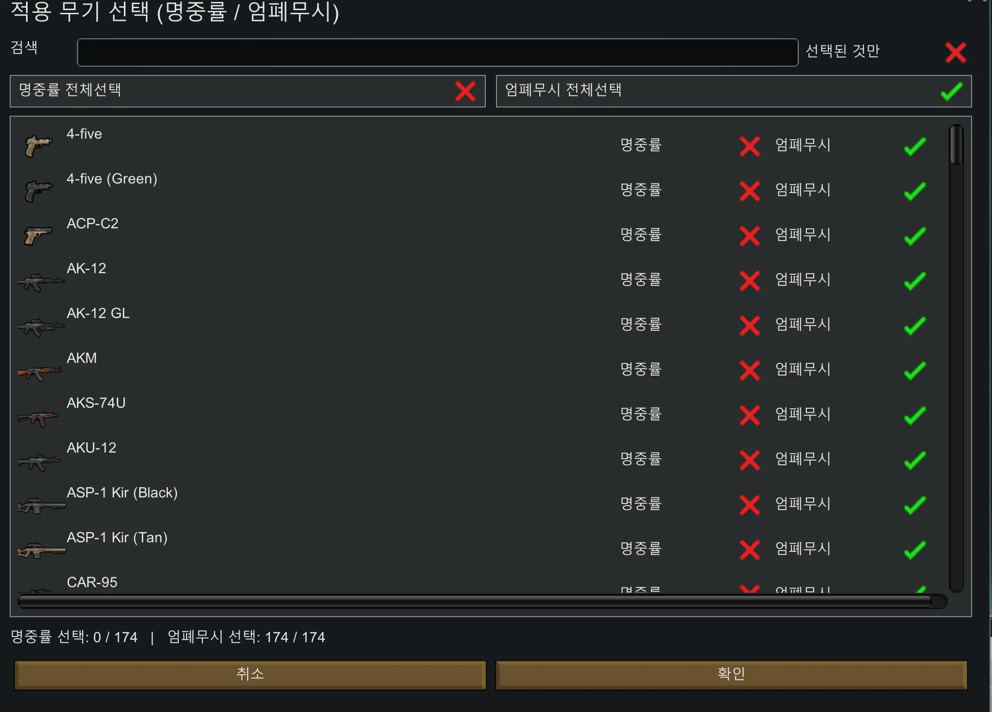 무기별 "사수"의 명중률의 보정치 및 엄폐 무시 설정을 제공하는 모드입니다(총의 명중률에는 영향 없음) 무기마다 다르게 설정할 수 있습니다.(사수의 명중률에만 영향을 미침) 내폰/내폰+건물/전체 폰 설정 기능 추가 최소 최대 명중률 설정 누락된 부분 추가