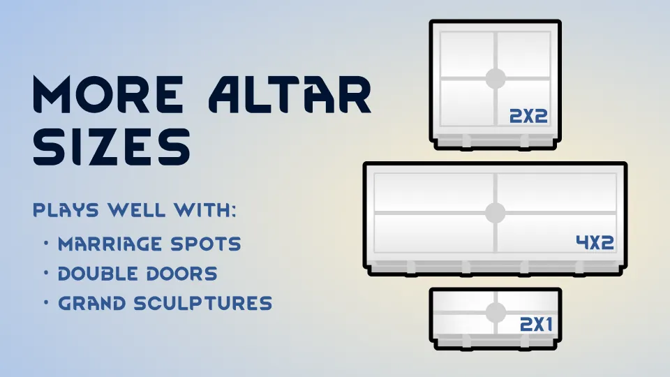 Tired of double doors and marriage spots not lining up with your altar? This mod adds three new sizes of altar —2x1, 2x2, and 4x2—to give you more flexibility when designing your ideoligion's temple room. Only includes the basic altar style.