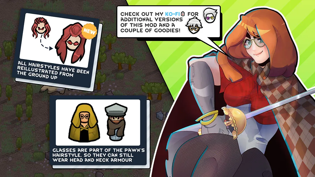 This is a HD update of my original Roo’s Glasses Hairs Mod- all hairs have been redrawn at a higher resolution and to match better with the vanilla art style. Each hairstyle has glasses rendered as part of it, so no more worrying about glasses taking up a valuable apparel slot.