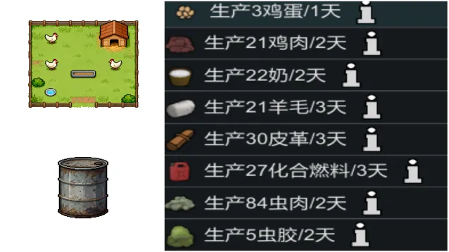 生产肉蛋奶的半自动牧场。这是一个早期版本,包含1个小型牧场和1个蛆虫桶,可通过配方消耗资源生产鸡蛋(未受精)、奶、羊毛、虫肉、虫胶。 由于它是静止的建筑,所以我使用白银作为建筑材料,你购买了这些实际不存在的动物在牧场进行生产。 基于Automatic Hydroponics 自动水培舱的框架制作的拓展建筑。 更多的拓展内容仍在制作当中。本模组将会陆续增加更多变体建筑以供装饰性选择。