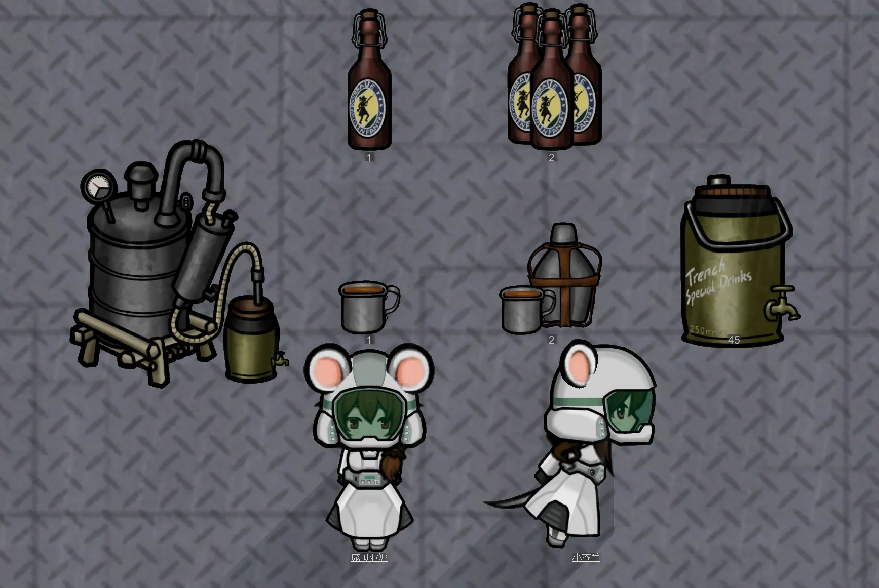 目前模组内容有限,仅包括一套鼠族通用太空服和两种酒饮