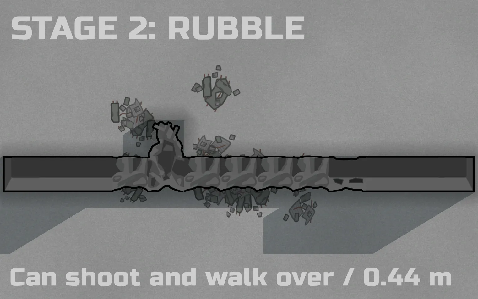 The final stage before total destruction, wall rubble allows both walking and shooting over. Essentially, a worse sandbag. In CE, will only give minor cover to feet and legs. Incapable of holding a roof. Rubble deterioates after a short period of time, so make sure to save what's left before it's trampled away into nothingness.