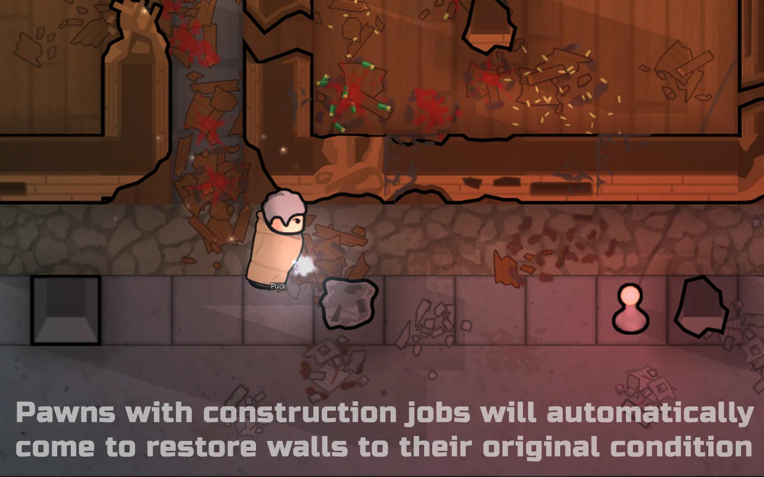 To restore a downgraded wall, a pawn with Construction work assigned must come and repair it. Walls that belong to your faction are automatically marked for restoration. Currently, only supports man-built walls. Natural rocks and smoothed mountains are not affected.