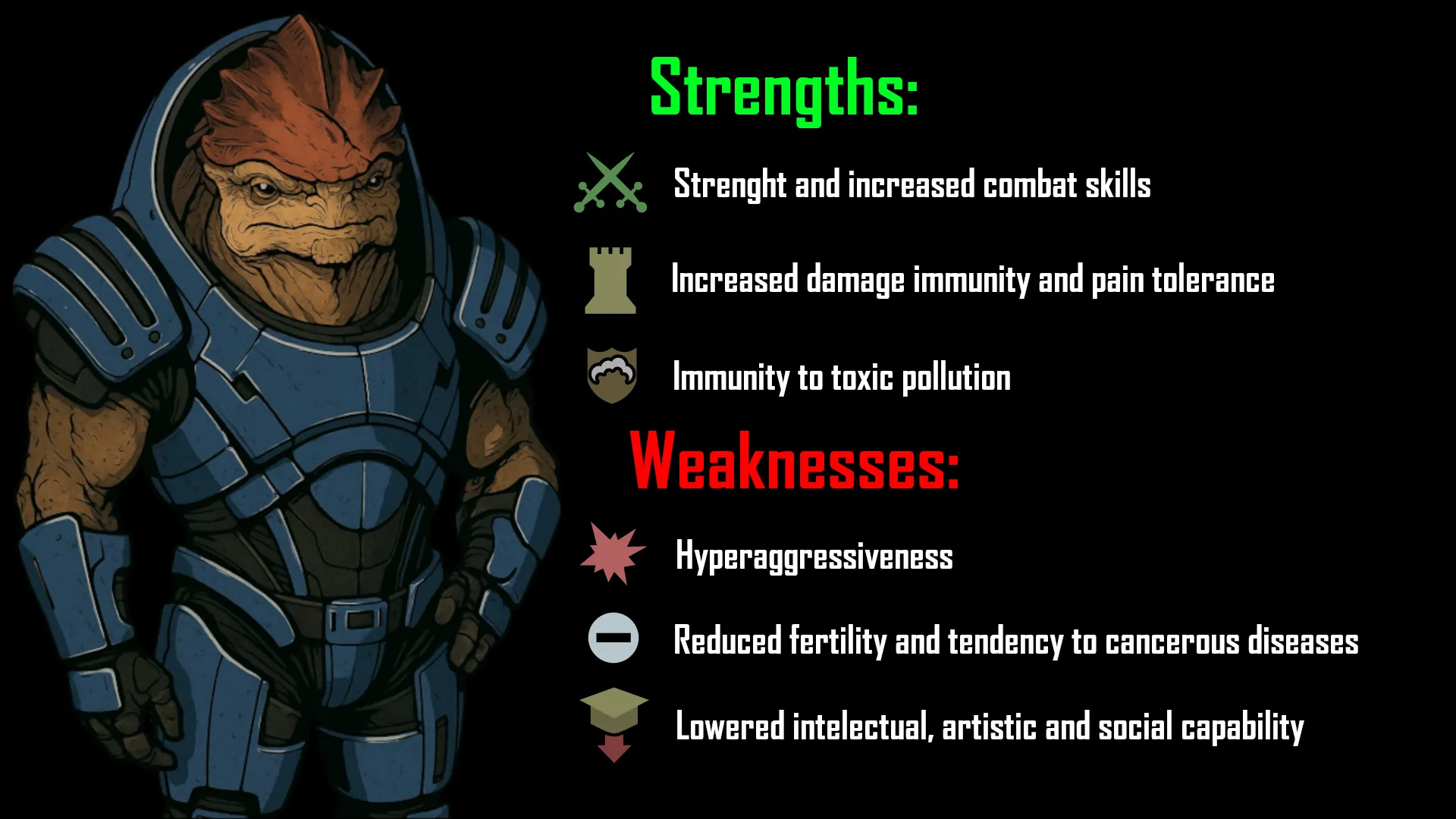 The Krogan xenotype had a major rebalance when implemented into the game, mainly nerfing it, here are some of it's main attributes: