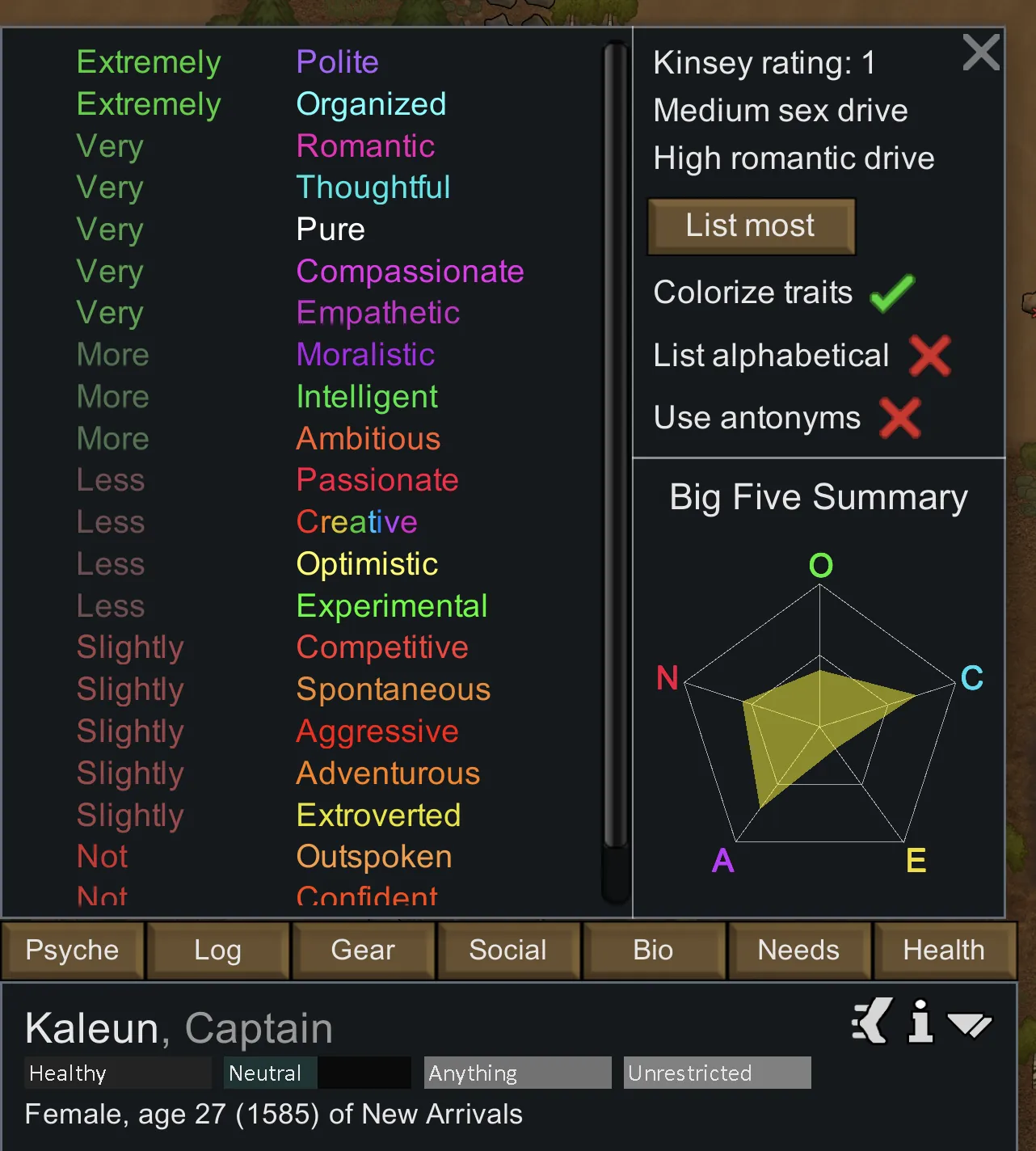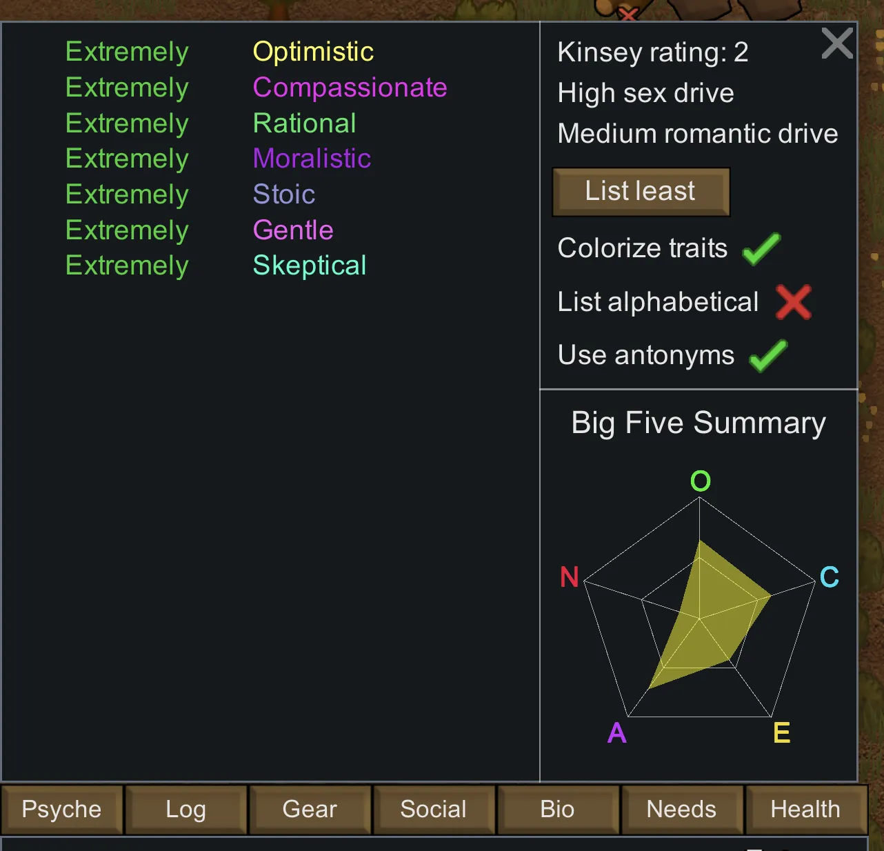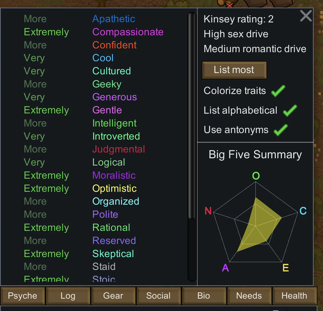 This is an unofficial update of The Word-Mule's Psychology mod for Rimworld v1.1. It's a complex overhaul to pawns social interactions, which adds psyche system where each pawns is unique (original 1.0 mod and full legacy description here: [url=https://steamcommunity.com/sharedfiles/filedetails/?id=1552507180)]https://steamcommunity.com/sharedfiles/filedetails/?id=1552507180)[/url].