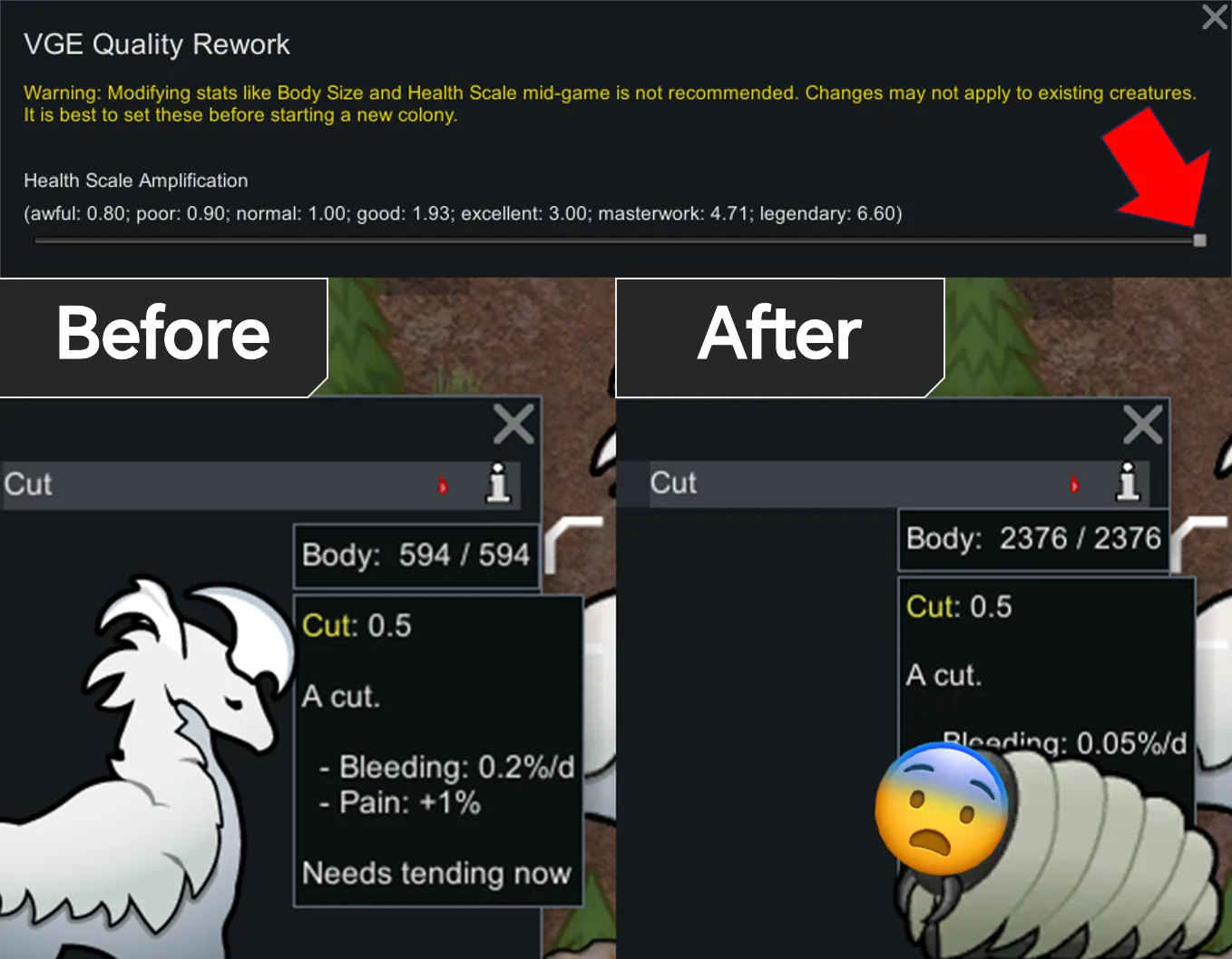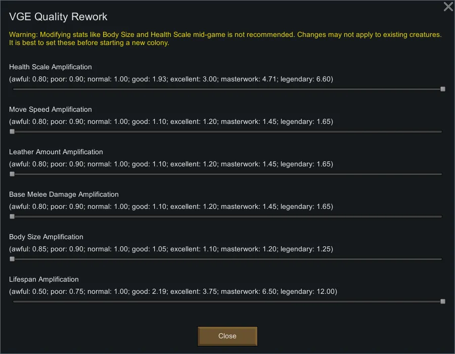 The higher the multiplier, the more massive the bonus high-quality animals receive. A multiplier of just 0.5 is enough to make a legendary Paragon Thrumbo a truly tough frontline tank. And if you crank everything up to 2—