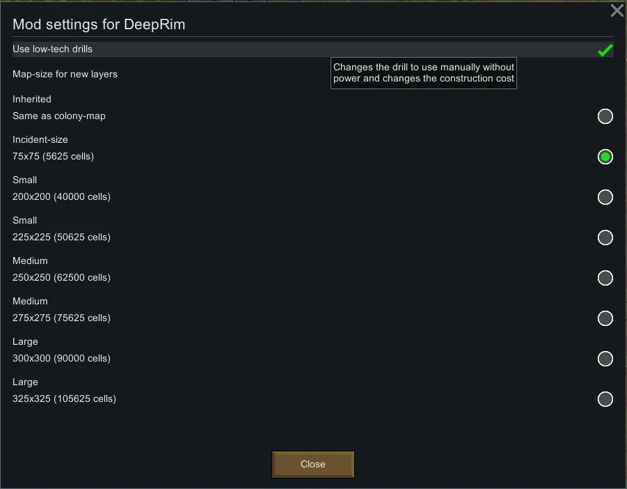 - Added mod-setting for low-tech mode where the drill is operated manually and don't require power