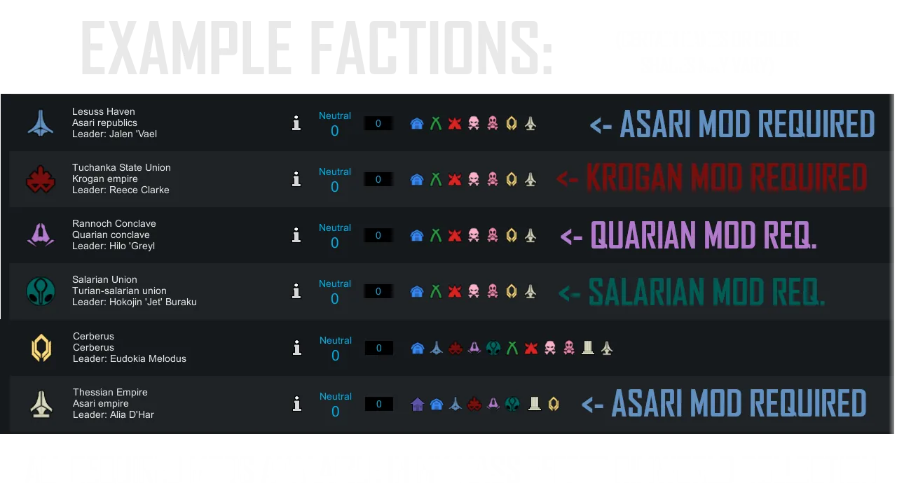 The standalone mod only adds the cerberus faction, all the other factions are based of my mass effect xenotype races, all avalaible in my collecion.