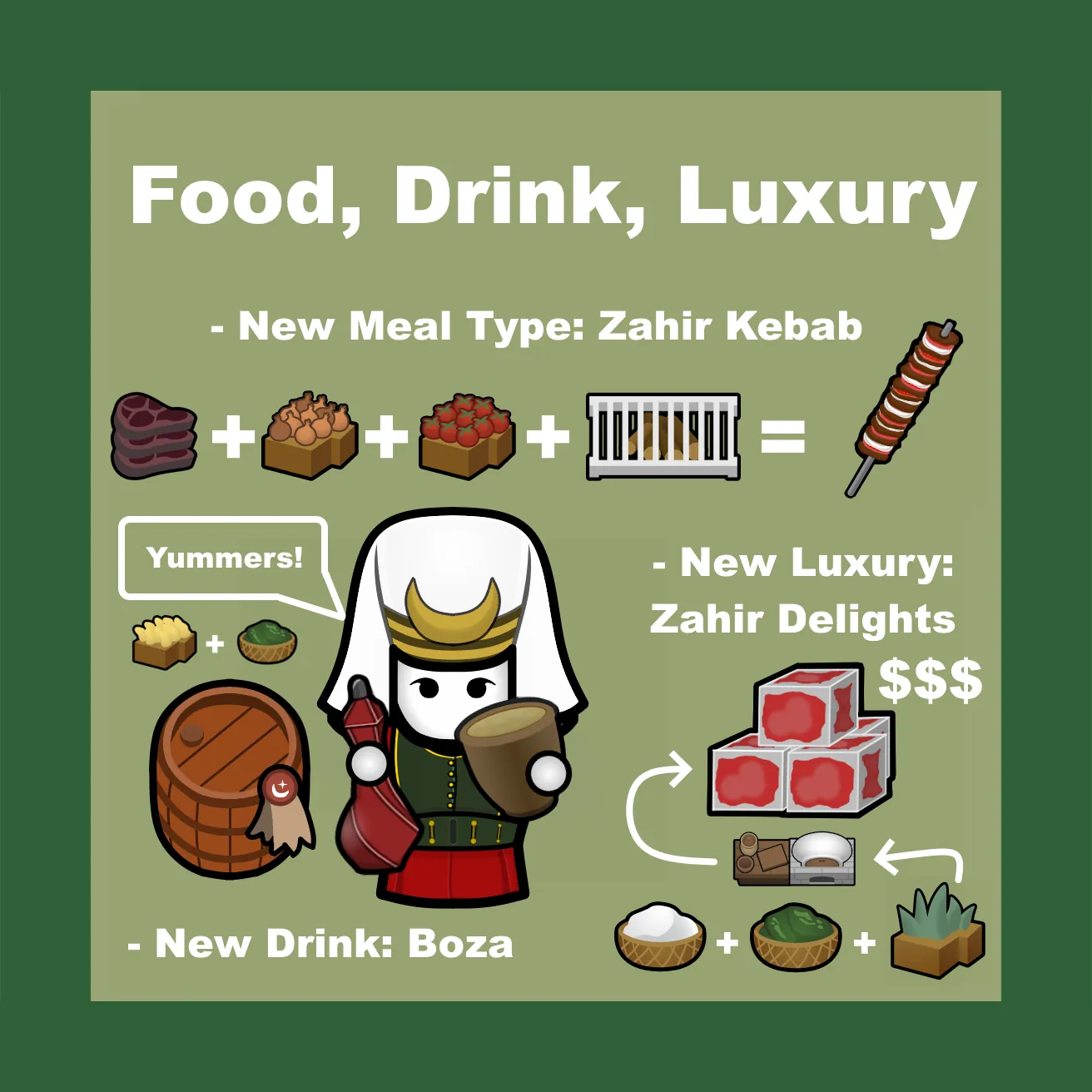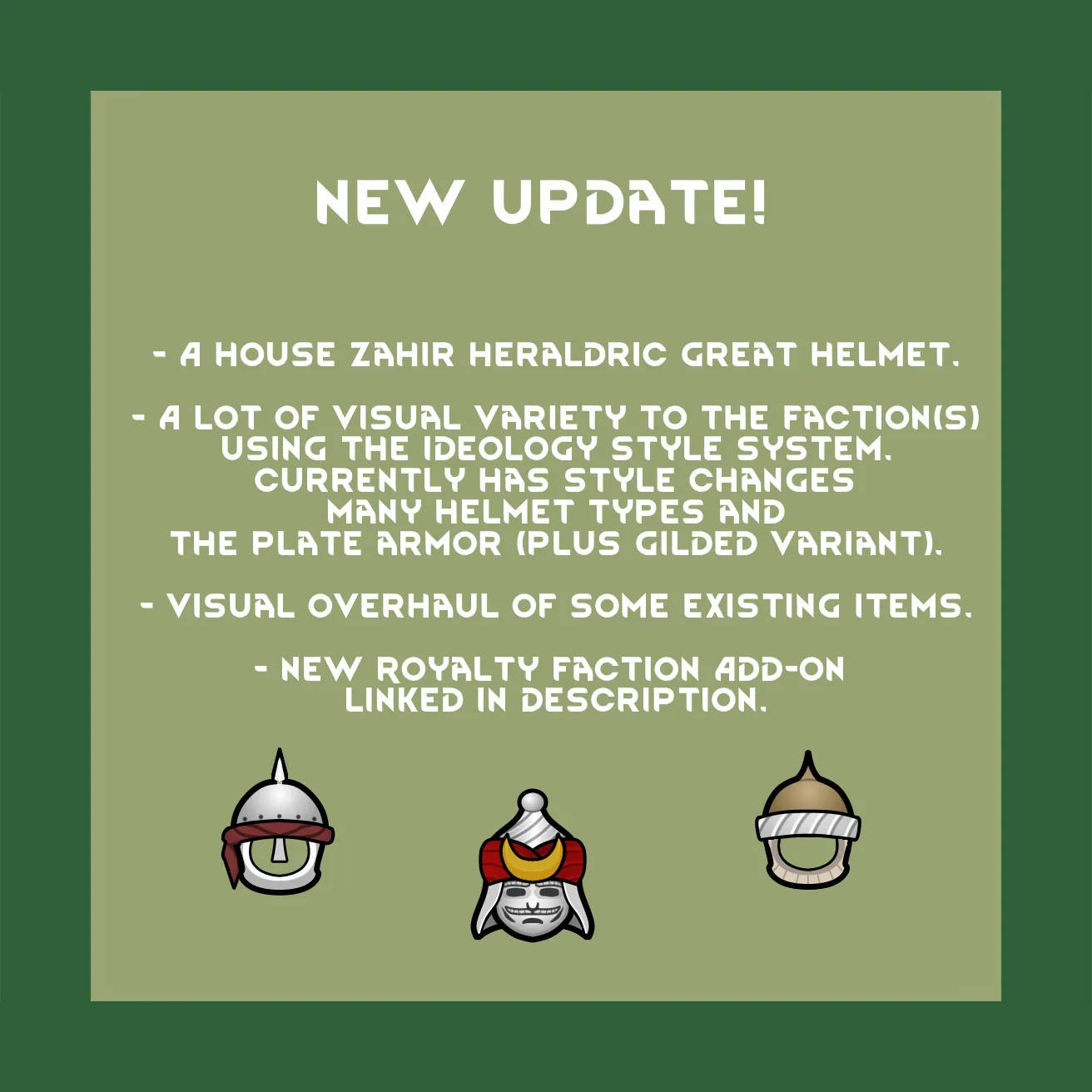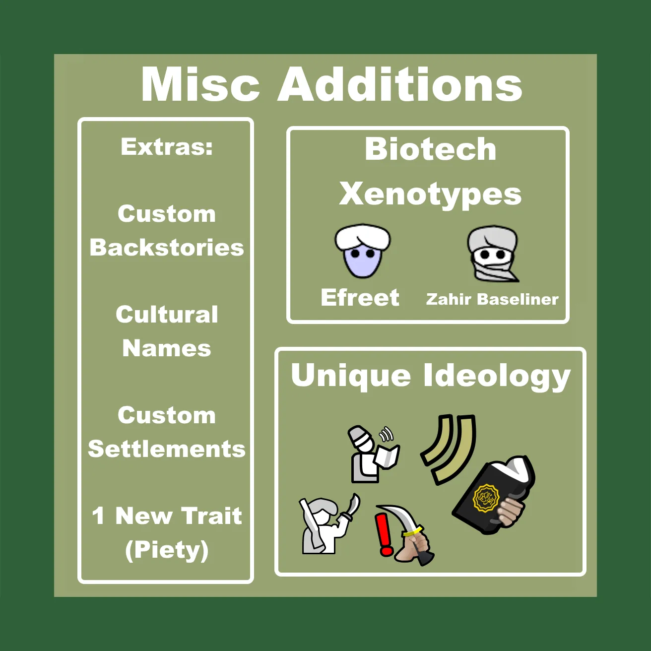House Zahir adds two new factions of Islamic/Ottoman inspiration, like all Rimworld or Medieval Overhaul factions they are not based on any specific culture, people or land but is instead my take on an Islamic/ottoman inspired culture that should fit right in with Rimworld's world building and themes.