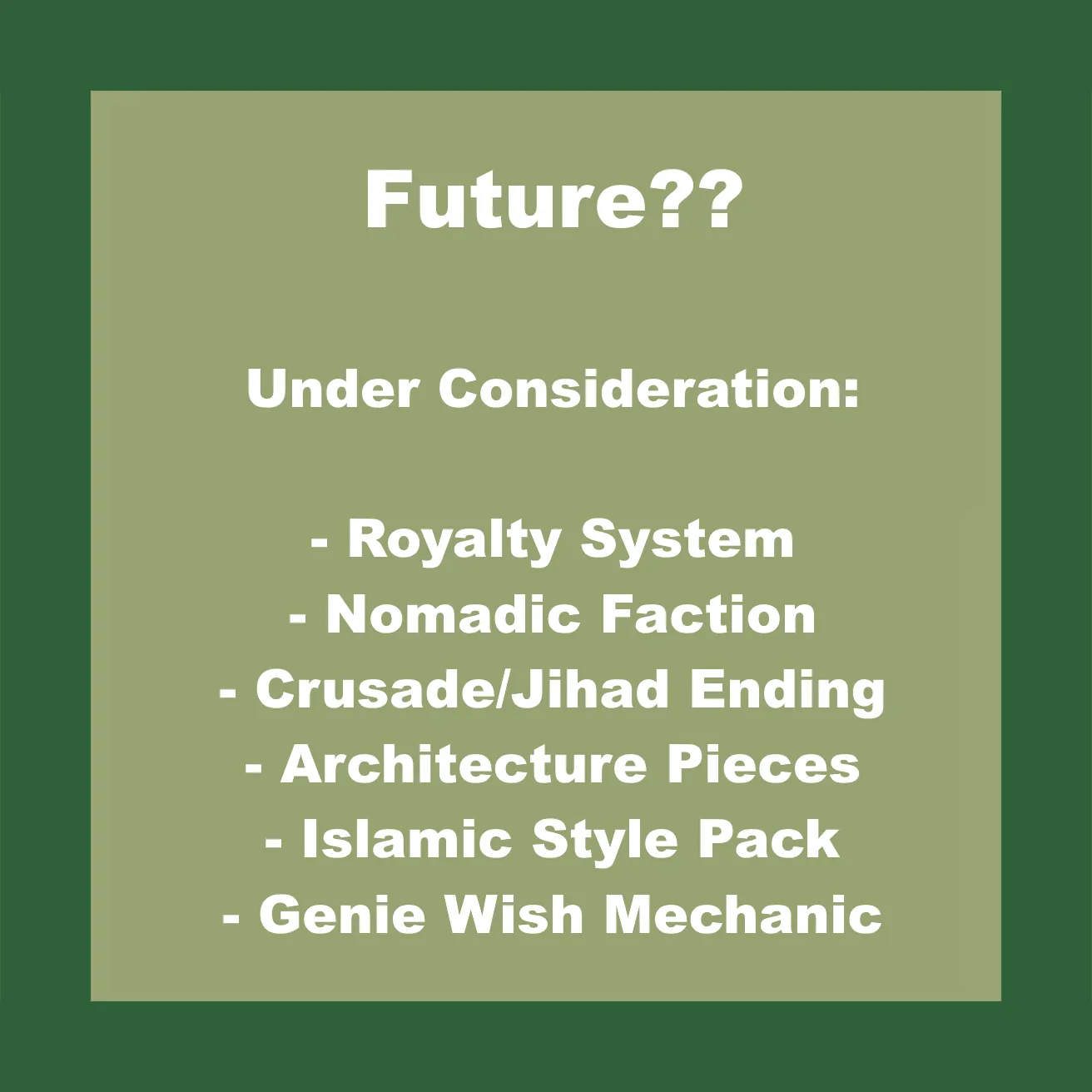 Honestly no clue, I want to continue making the style pack more varied and extensive, I also want to attempt to implement an Aladdin style Genie mechanic to the game with wishes that may or may not help you and the like. I will probably balance this a lot in the future as I'm not good at this and haven't had time to fully playtest everything yet. I want to add an ending to the game where you fight off a crusade as a kind of ending scenario or destroying the faction as said crusaders. I am not skilled enough or have free time enough to feel comfortable saying that it will come, but I want to make it.